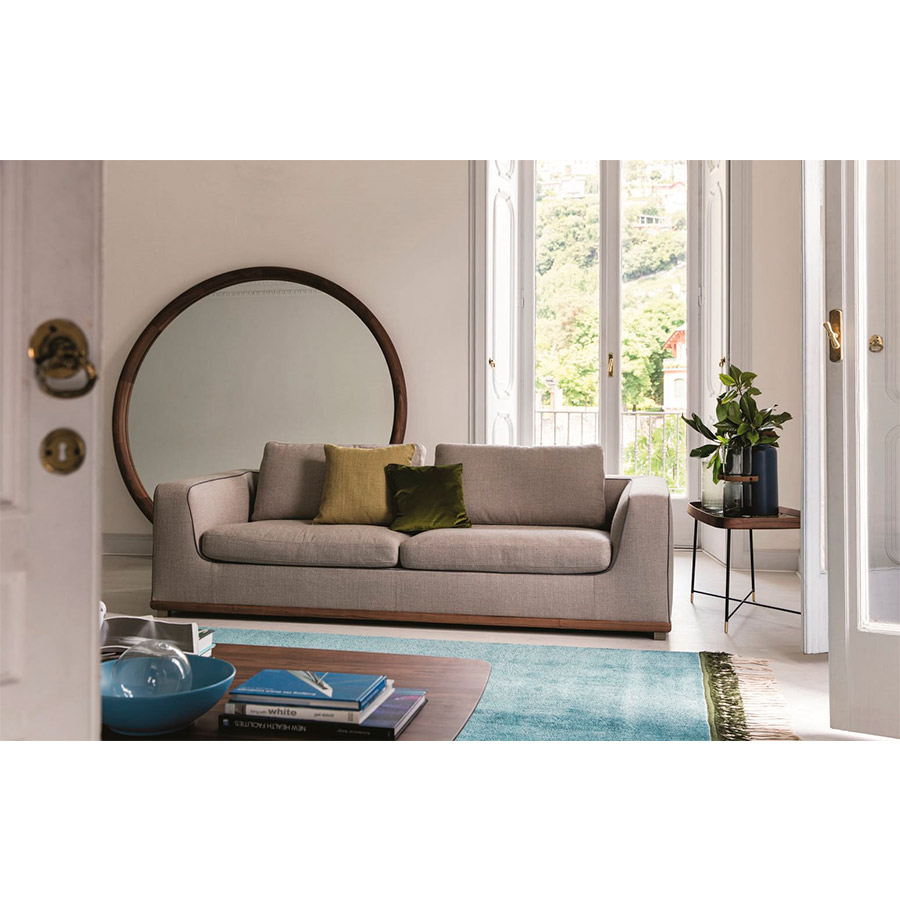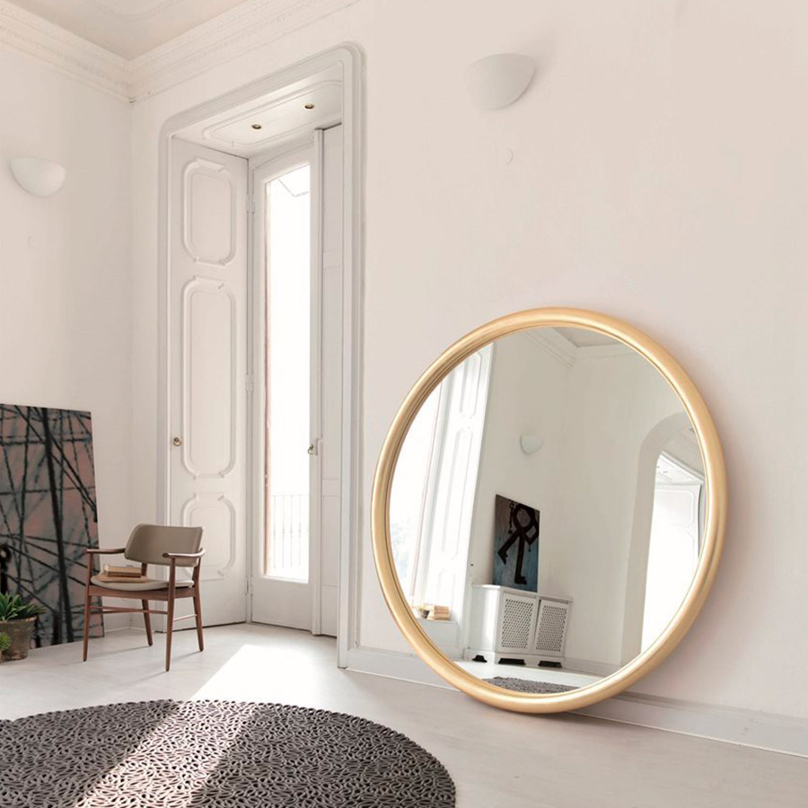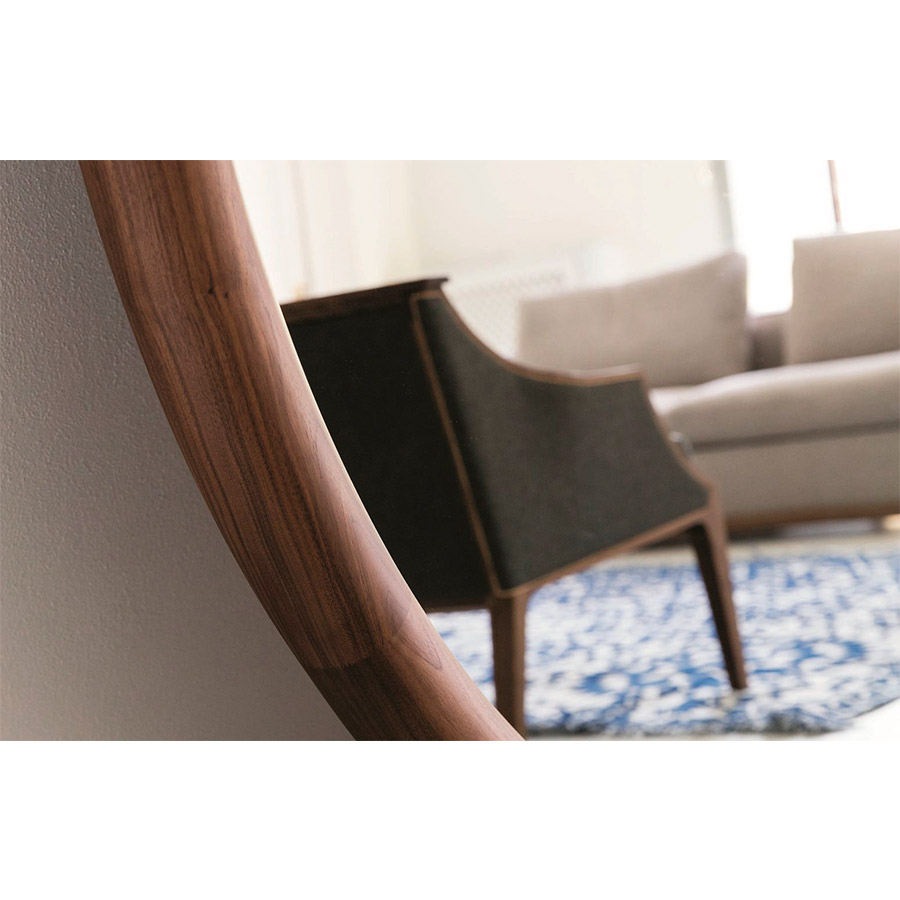 Espejo redondo de pared o en apoyo con marco en nogal canaletta macizo. Es necesario remover los pies de soporte para fijar el espejo a la pared.