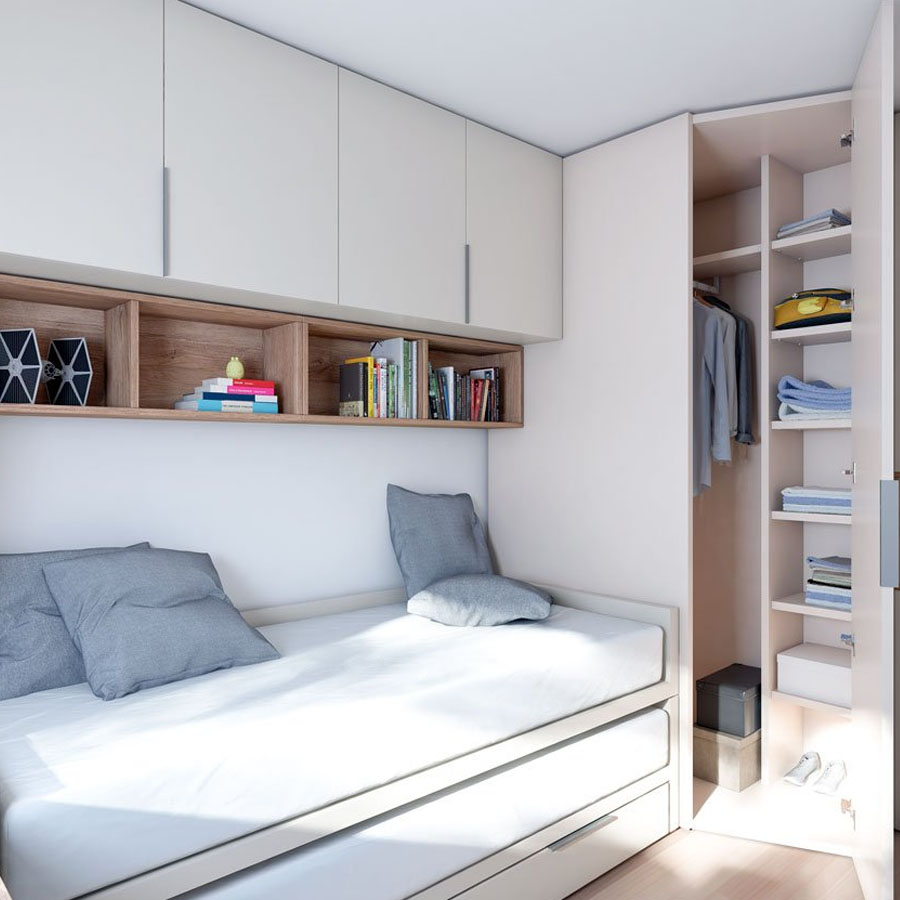 Con Jota Jota P podemos diseñar la habitación en función del espacio y los gustos. En este caso, tenemos una cama nido que permite ganar espacio durante el día.