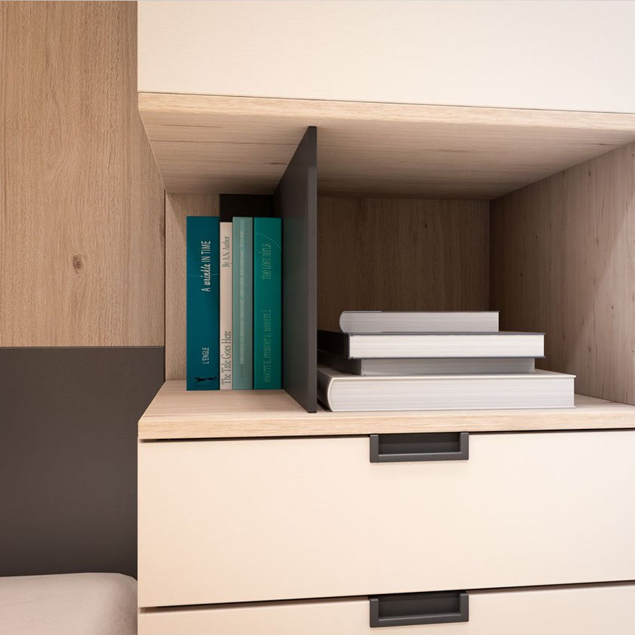Con Jota Jota P podemos diseñar la habitación en función del espacio y los gustos. En este caso, tenemos una cama individual con un cabezal arcón extraíble y base de cajones.