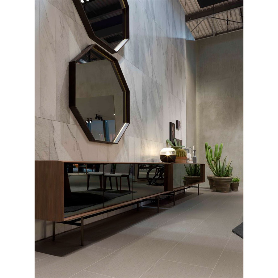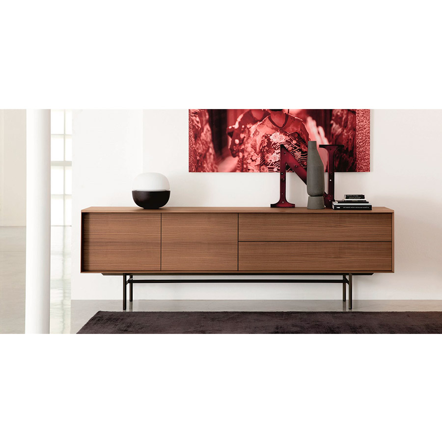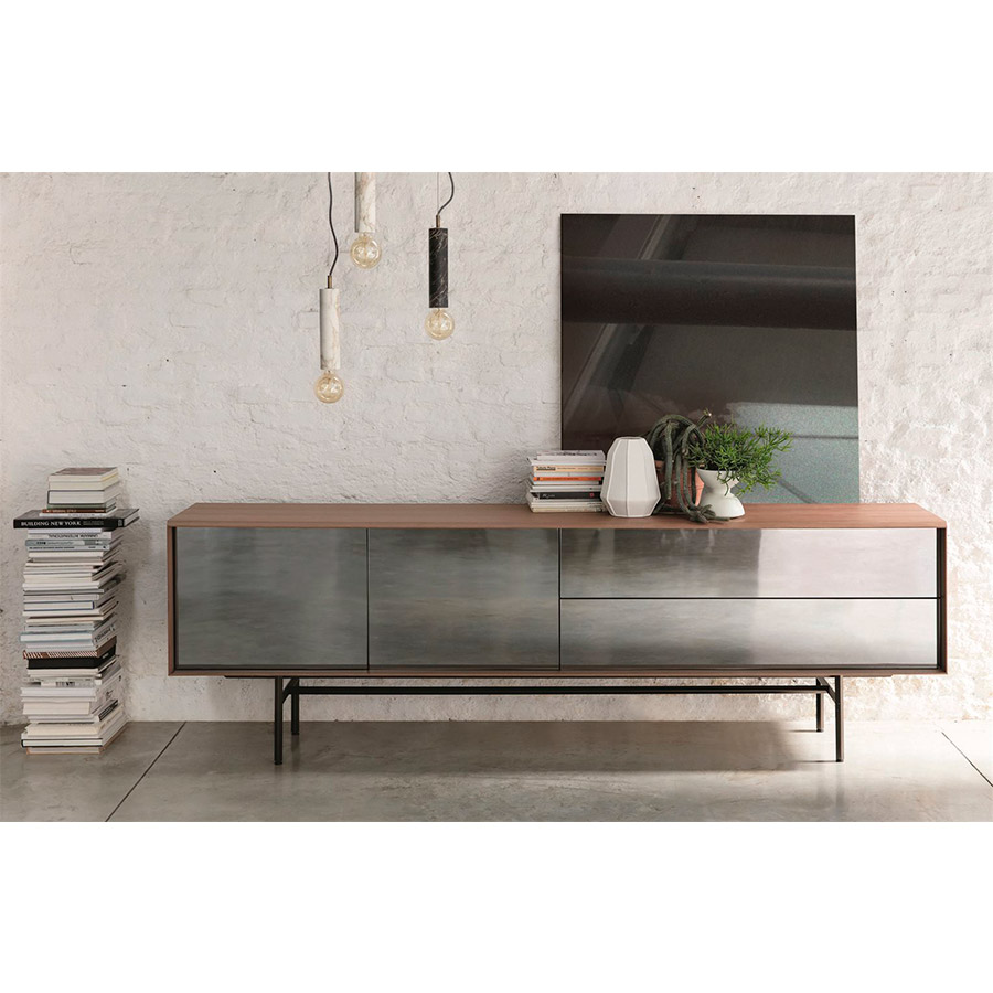 G. CarolloAparador en nogal canaletta con dos puertas con apertura a presión y dos cajones de extracción total con apertura presionar y soltar. Los frentes pueden ser de madera o revestidos de espejo ahumado. Base de metal en acabado bronzoro. Interiores de los cajones en contrachapado de nogal canaletta. 240x54x78H