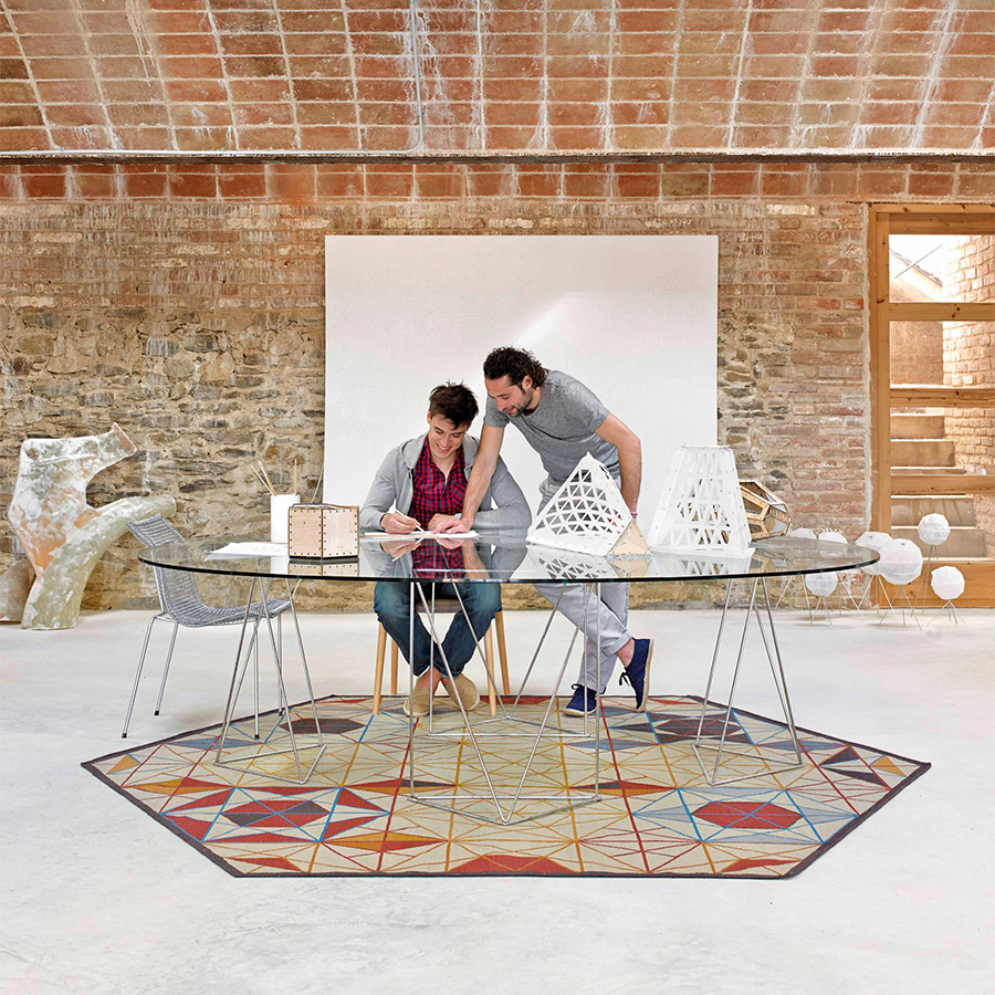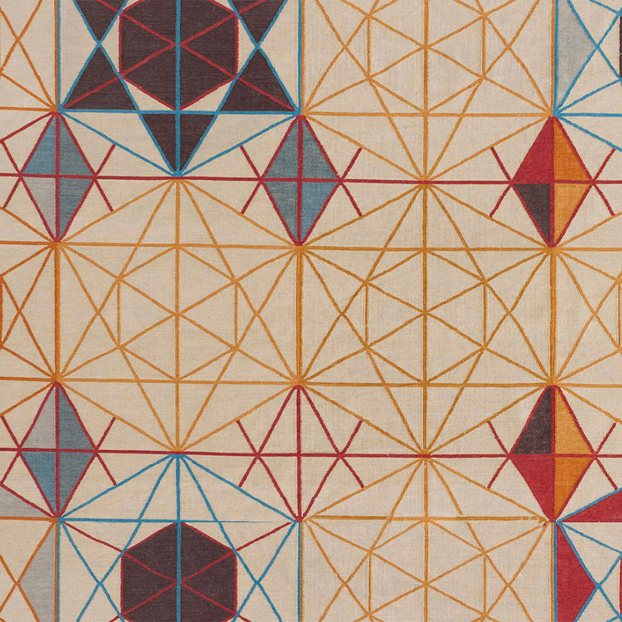 Este es el modelo rectangular de la alfombra Hexa de nuestra colección de kilims, una pieza disponible también en formato hexagonal. Diseñada por el estudio Enblanc, su apariencia es el resultado de querer mostrar en toda su riqueza la compleja variedad de posibilidades geométricas que puede llegar a encerrar un mosaico de hexágonos. Mediante líneas que van en todas las direcciones, es posible distinguir distintos tipos de triángulos, varios tamaños de rombos y hexágonos e, incluso, rectángulos y octógonos. Algunas figuras presentan con una cierta aleatoriedad un color sólido, otras solo aparecen contorneadas. Disponible en cuatro tamaños, es un modelo muy ligero y reversible, elaborado con hilos de varias tonalidades de verde, naranja, marrón, granate, rojo, crudo, azul y negro.