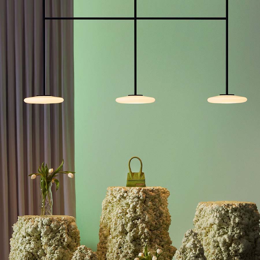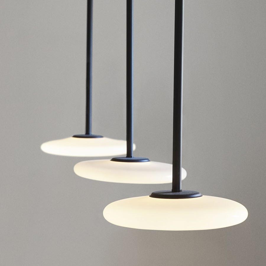 Ihana, que significa exquisito en finlandés, cuenta con una elegante y delicada selección de líneas. Demostrando una síntesis de contrastes, la estructura negra metálica austera integra tres difusores de vidrio soplado opal debajo, equilibrando elementos delicados y firmes dentro de un diseño contemporáneo. Disponible en tres generosas longitudes, la luz de suspensión puede integrarse a la perfección en una serie de ambientes interiores, iluminando ingeniosamente impresionantes techos altos.