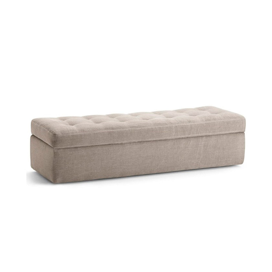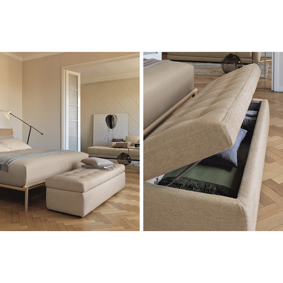 El asiento blando, que puede abrirse, oculta un espacio capaz donde guardar fundas nórdicas, almohadas y otros objetos.