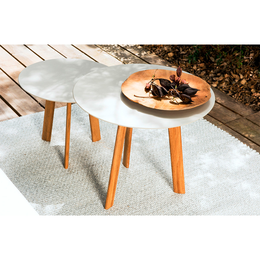 Las mesas auxiliares ILE combinan cualidades funcionales con un simple, a la par que cálido, diseño estético. Las patas cónicas son de teca de primera calidad procedente de plantaciones del este de Java. La parte superior de aluminio se ha recubierto con laca que dispone de una estructura ultraduradera.