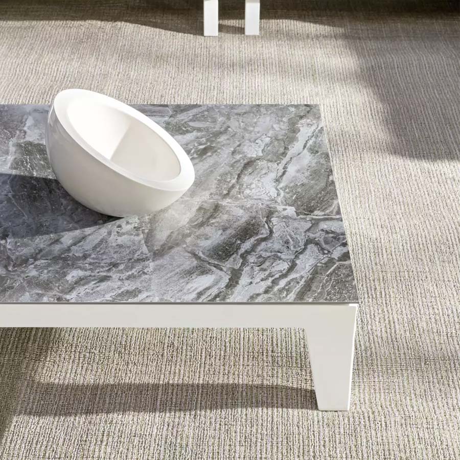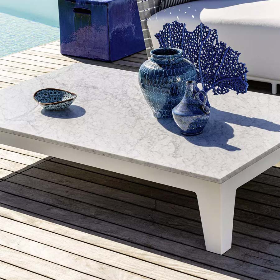 Mesa de centro rectangular, la Inout 155 nace de la combinación de diferentes materiales: formada por una estructura de aluminio pintado de blanco mate, gris o salvia, tiene el tablero disponible en diferentes acabados: con duelas de teca natural, de mármol blanco de Carrara o de gres porcelánico gris, dando origen a un producto de extremada versatilidad.