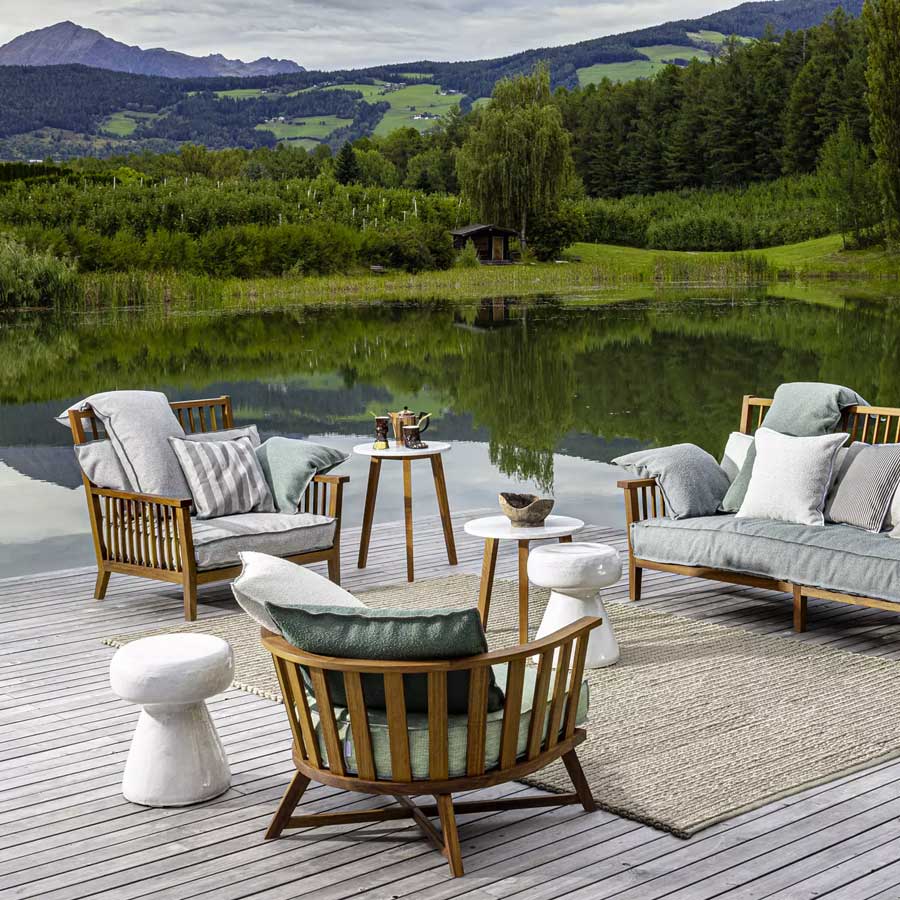 Sillón envolvente y confortable, el Inout 701 tiene una estructura de duelas: está realizado en Iroko aceitada, madera particularmente duradera, por ser naturalmente resistente al agua y a la humedad. El contraste entre la solidez de los amplios listones y la suavidad de los cojines sueltos desenfundables de poliuretano expandido repelente al agua, otorga carácter a este accesorio de decoración.