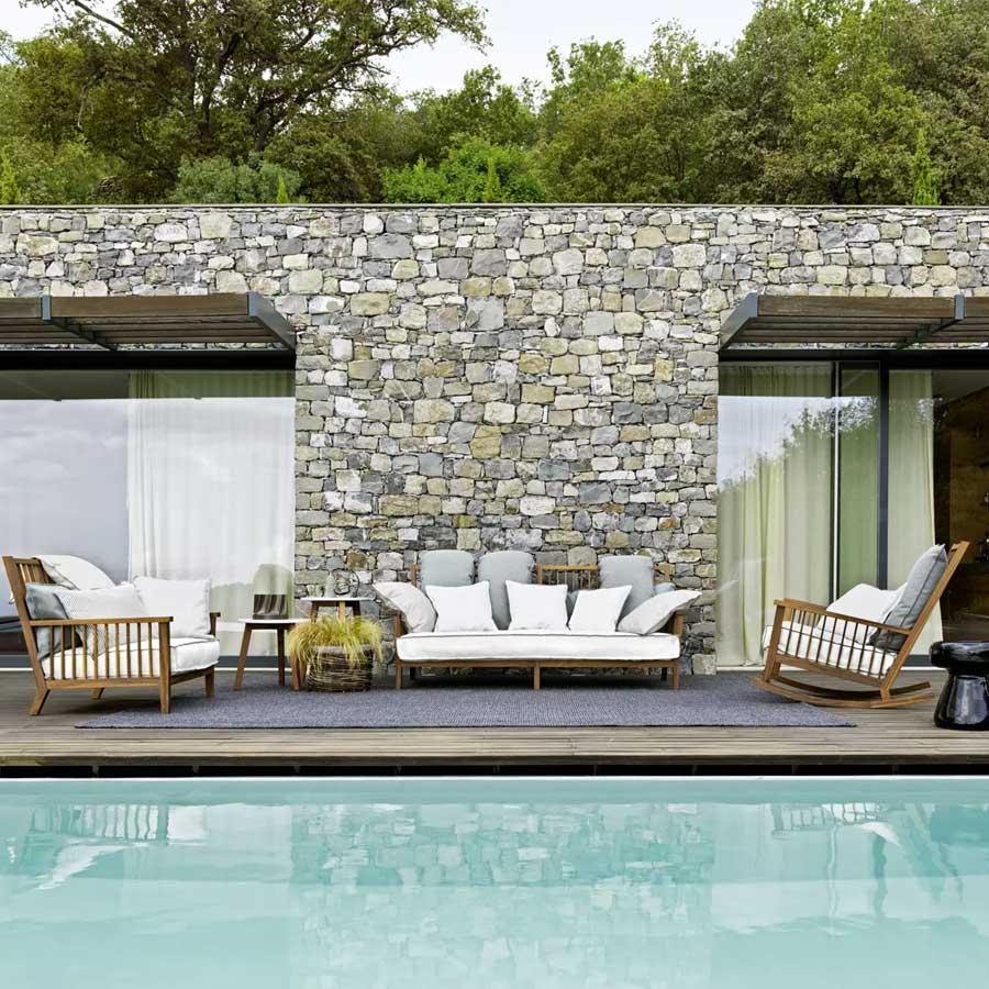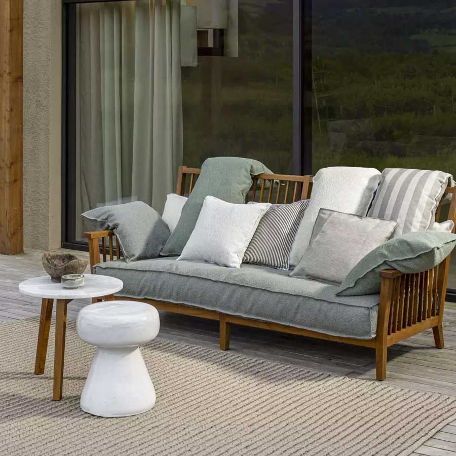 Sofá envolvente y confortable, el Inout 703 tiene una estructura geométrica de duelas con respaldo alto: está realizado en Iroko aceitada, madera particularmente duradera, por ser naturalmente resistente al agua y a la humedad. El contraste entre la solidez de los amplios listones y la suavidad de los cojines sueltos desenfundables de poliuretano expandido repelente al agua, otorga carácter a este accesorio de decoración.