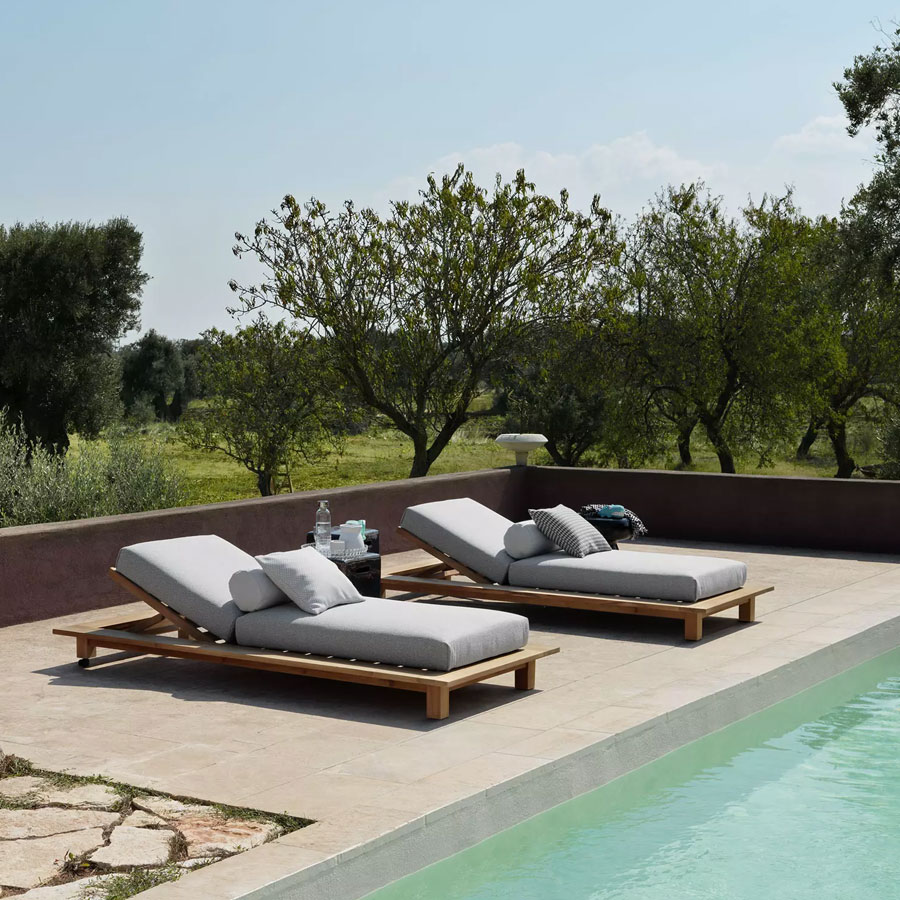 La tumbona Inout 81 se caracteriza por una estructura reclinable que combina la ductilidad y la resistencia de la teca natural con una colchoneta revestida y desenfundable, con cojines sueltos para una mayor suavidad.