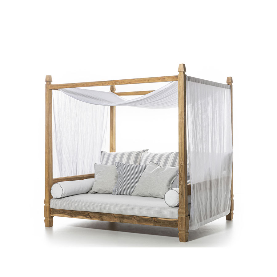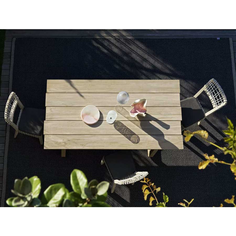 La refinada esencialidad nórdica define a la silla Inout 865. Tiene la estructura de teca lavada, una de las maderas tropicales más preciadas, sometida a tratamiento de envejecimiento que determina el particular tono gris de la superficie, lo que da a los productos un delicado atractivo. A esto se une un especial tejido de malla hecho de cuerda de polietileno de alta intensidad, que brinda un atractivo artesanal al producto.