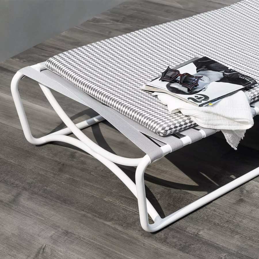 La tumbona Inout 884 se caracteriza por una estructura fija, no reclinable, de aluminio pintado de blanco mate, gris o salvia. La estructura está embellecida por un entramado de cinta elástica en azul, negro o gris, sobre el cual es posible colocar una colchoneta desenfundable para lograr mayor suavidad.