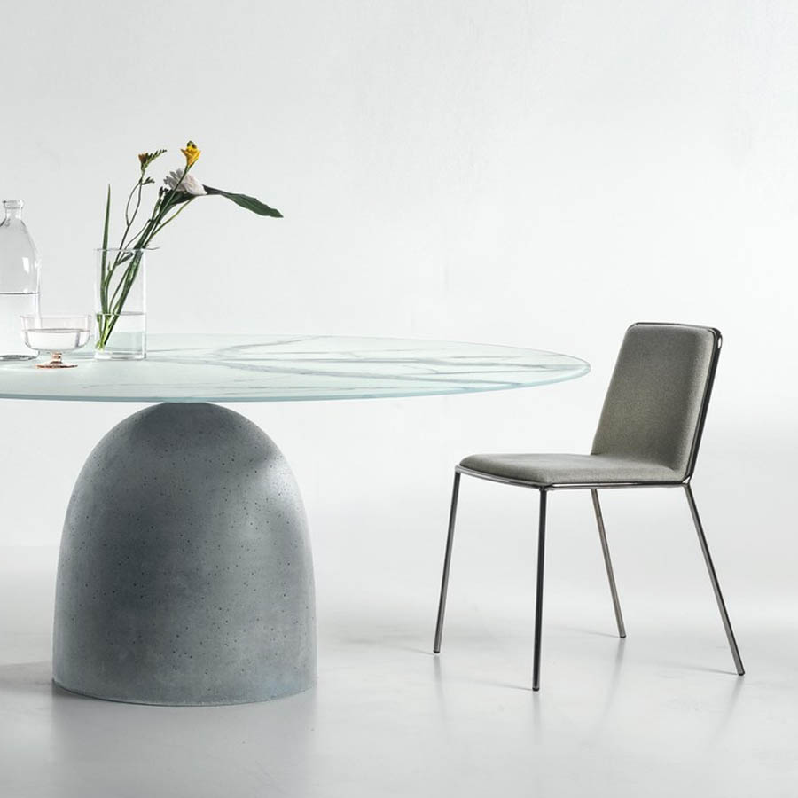 Bartoli DesignLa línea de un sólido rocoso ha inspirado el diseño de la mesa Janeiro. La forma característica del bloque de cemento que conforma la base evoca el famoso promontorio brasileño, el «Pan de Azúcar» de Río de Janeiro. La base de la mesa en efecto juega con dos sólidos en forma de cúpula, en equilibrio entre sí, mientras que el tablero de la mesa parece estar mágicamente en equilibrio sobre la cima de la base. La propuesta sencilla y matérica del cemento abraza perfectamente las líneas blandas de la base y del tablero disponible en forma circular, abarrilada o rectangular.