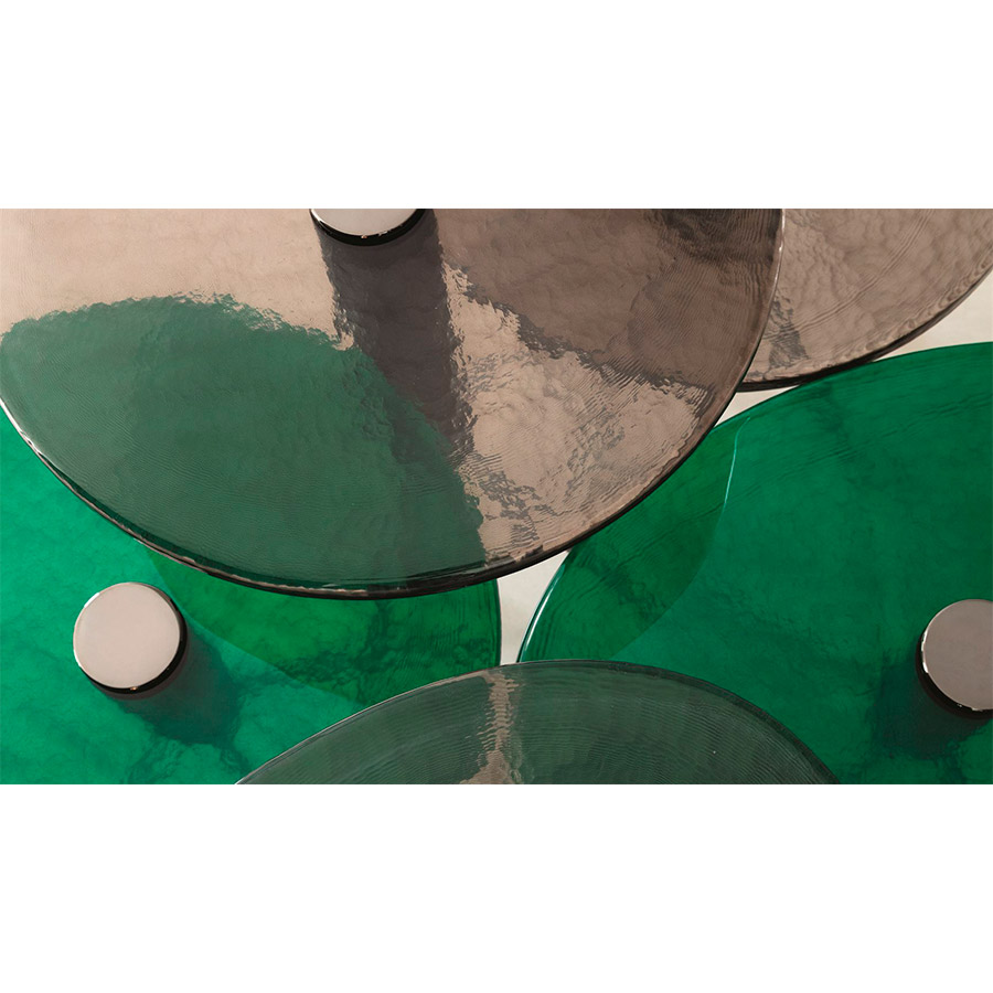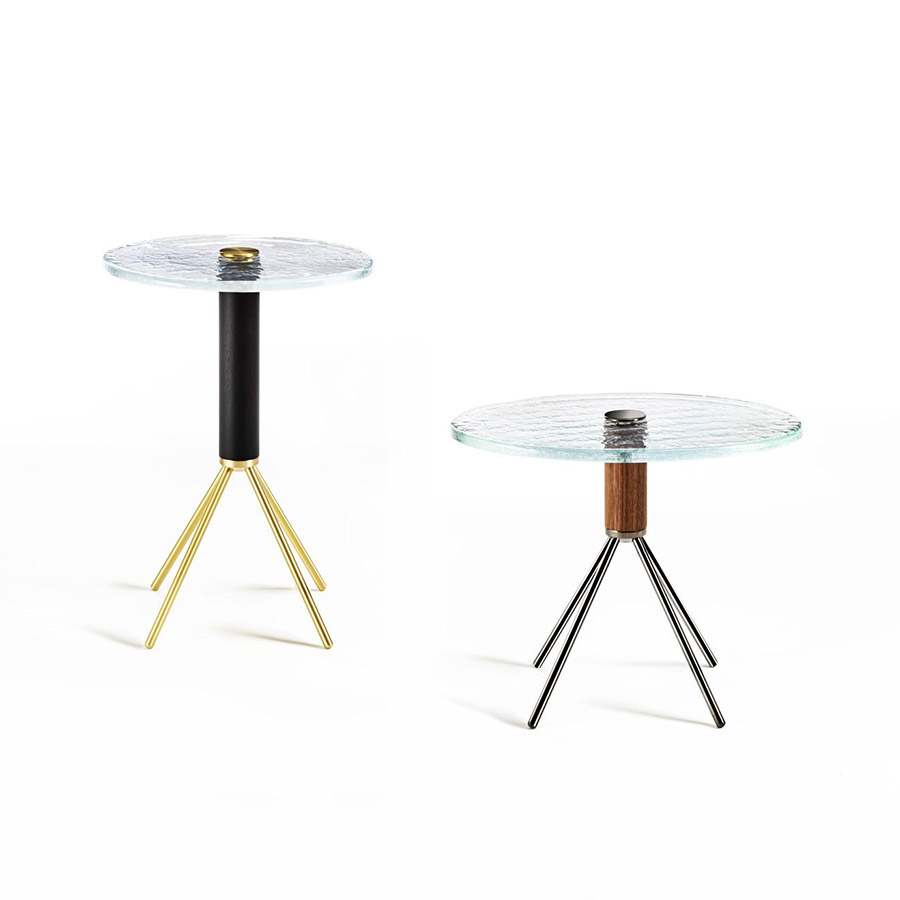 C. BallabioMesa auxiliar con base en metal cromo negro y columna central de nogal canaletta macizo. Tapa en vidrio fundido (espesor 15 mm) con placa de metal cromo negro. Jelly está disponible en diferentes medidas y dos alturas – 40 o 55cm – ovalada 50×35 – redonda diametro 40