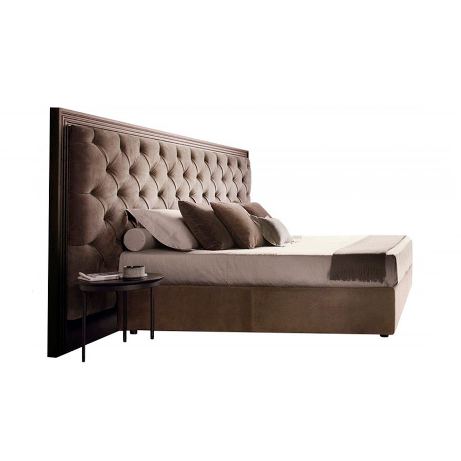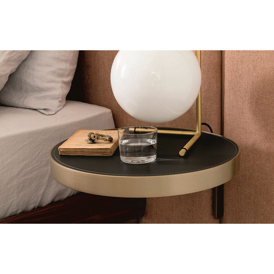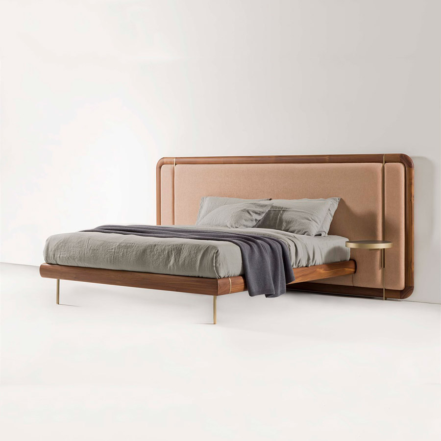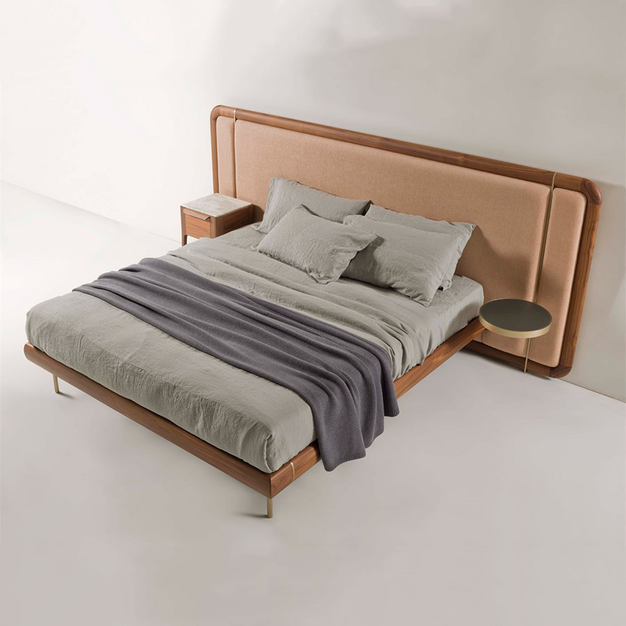 M. Marconato T. ZappaCama con estructura de nogal canaletta, duelas de madera o base de contrachapado de abedul, y pies de latón cepillado. Cabecera con marco de nogal canaletta macizo tapizada en las telas de la colección. Mesas de noche suspendidas opcionales con tapa revestida en Cuoietto o en Rock en los colores de la colección.