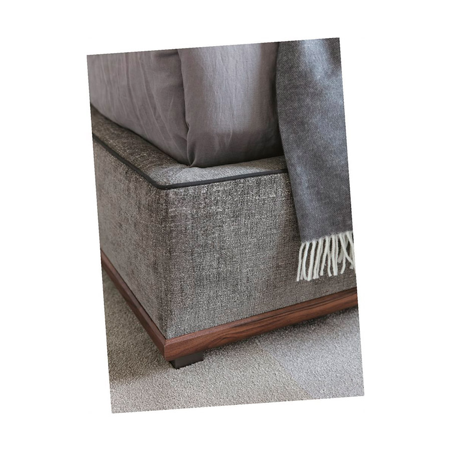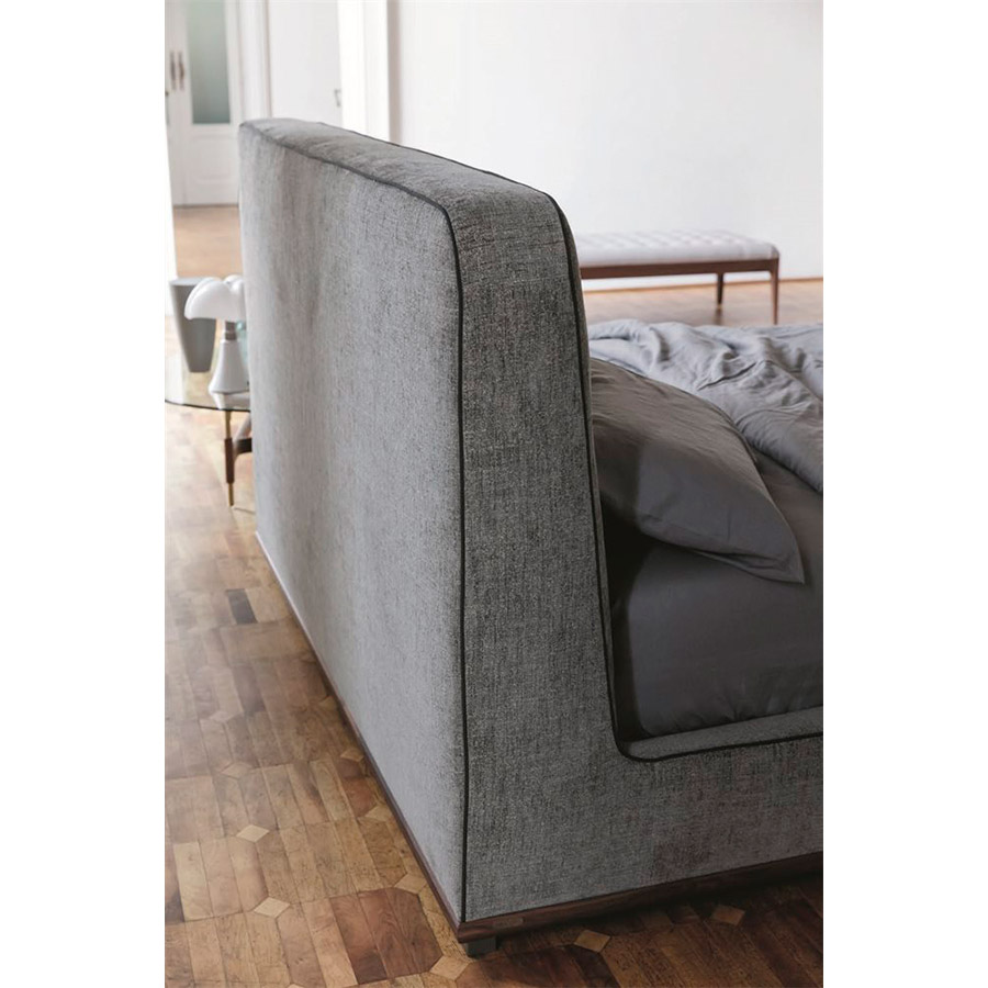 C. BallabioCama revestida en las telas de la colección con duelas de haya y base en nogal canaletta macizo con pies de metal gris peltre. Estructura de madera maciza y de contrachapado, revestida con poliuretano expandido indeformable.