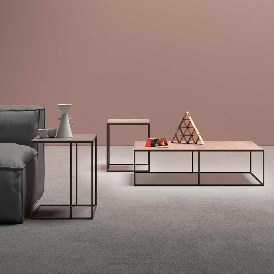 Kobe es una mesita cuadrada o rectangular con estructura de metal barnizado y sobre de madera. Presenta unas líneas sumamente limpias y está disponible en tres tamaños.