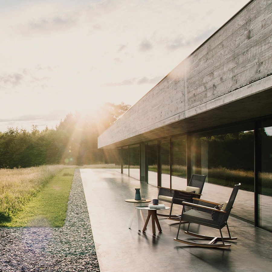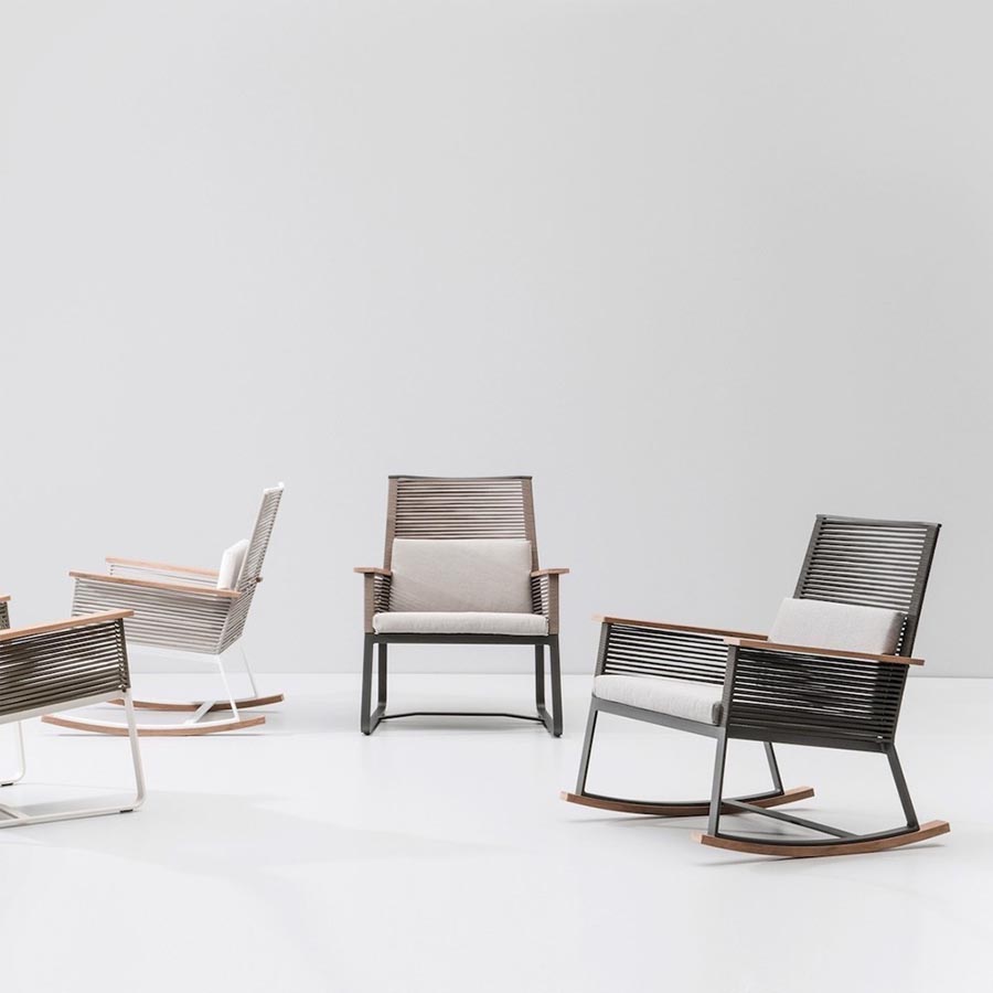 Equipo KettalMecedora de aluminio con reposabrazos de teca. Disponible en todos los colores de la colección Kettal Landscape diseñada por Kettal Studio. Un sistema muy completo que se compone de “daybeds”, pérgolas totalmente configurables y muebles de aluminio personalizables que se integrarán perfectamente en entornos naturales. La calidad del nuevo tejido estructurado Natte, el volumen y confort de de las confección es así como la modernidad de sus proporciones le confieren un aspecto elegante.