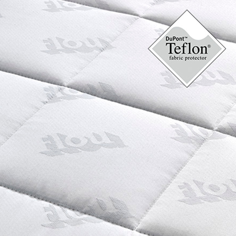 Colchón de línea tradicional provisto de plancha 100% látex. La funda tratada Teflon® es a prueba de mancha e hidrófuga.