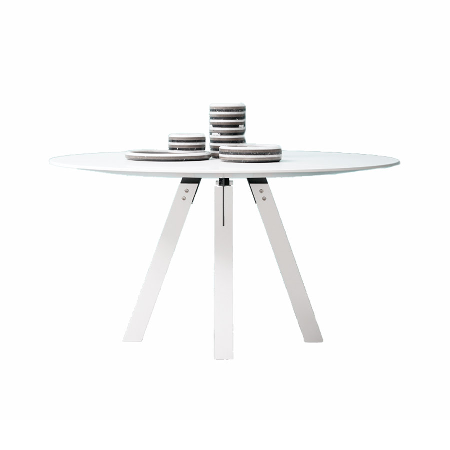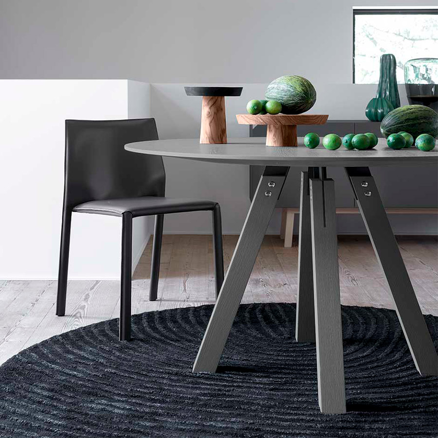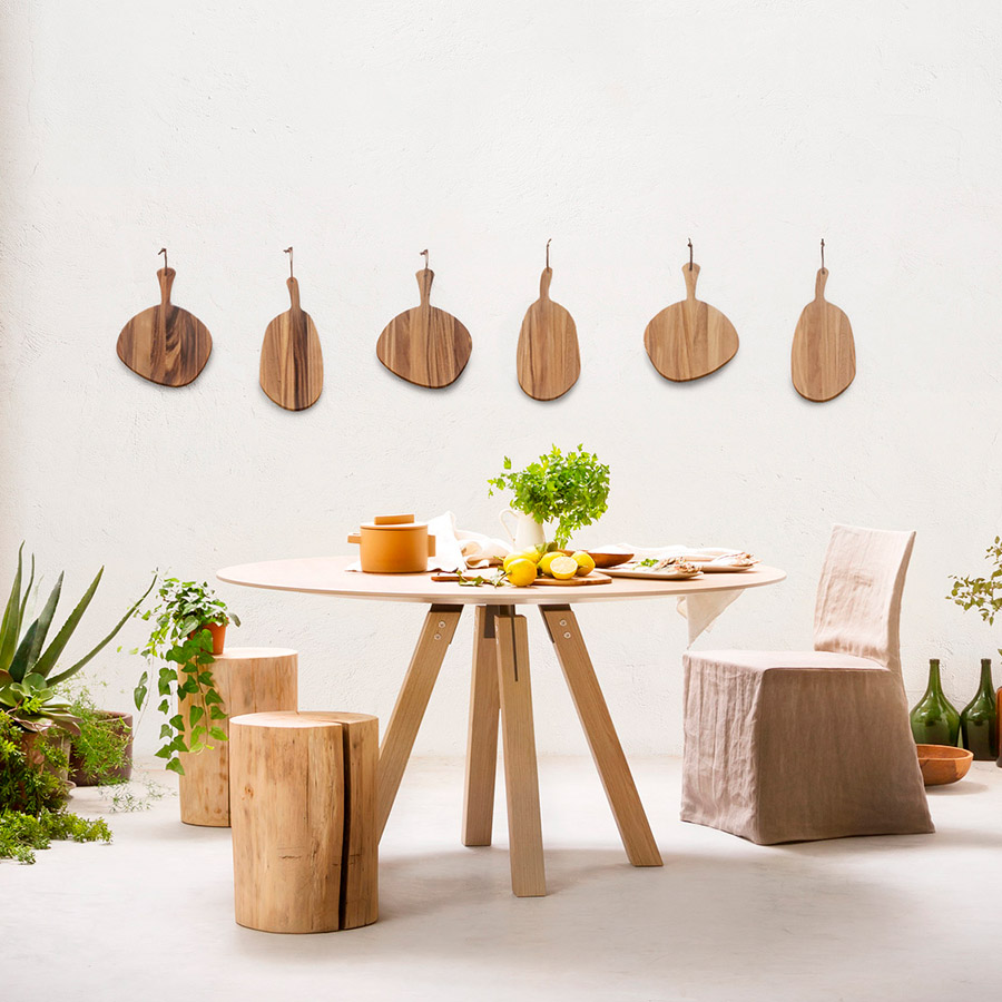 Bruna VaccherLe 20 es una mesa con estructura de madera de forma redonda disponible en dos tamaños. Las patas inclinadas sostienen el sobre, donde un juego gráfico da vida a un reloj que marca las ocho de la tarde.