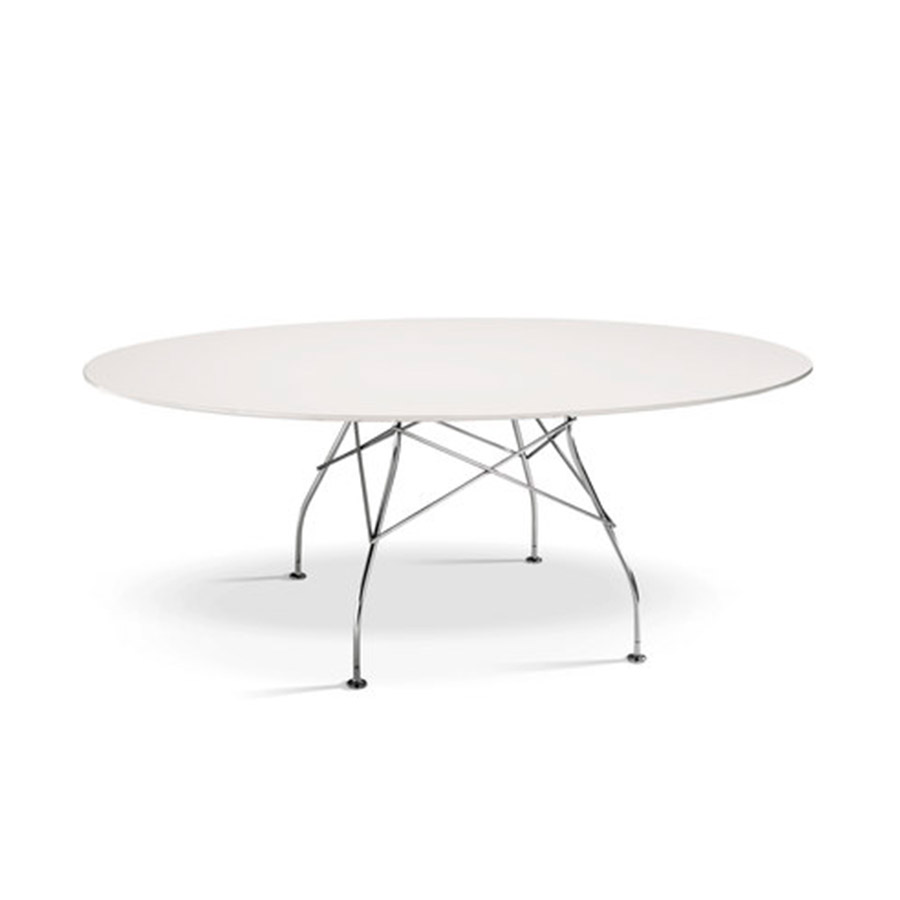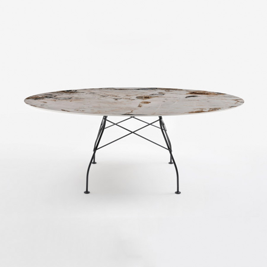 Antonio Citterio Glen Oliver LöwEl nuevo acabado de mármol, que se suma a las versiones en blanco, negro y rojo, enriquece esta colección de mesas ya histórica, ideales tanto para el entorno doméstico como para la oficina y caracterizadas por la elegancia y el refinamiento del diseño. La estructura ligera en acero cromado, especial para el uso del elemento en cruz que une las patas en cada uno de los cuatro lados, ofrece el apoyo en el suelo de diferentes materiales. La colección se presenta en las versiones cuadrada, ovalada y redonda. Gracias a la sencilla combinación, las mesas cuadradas pueden dar vida a planes de trabajo que se pueden incluir también en los contextos más representativos de la oficina, como la sala de reuniones.