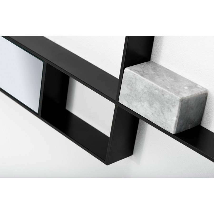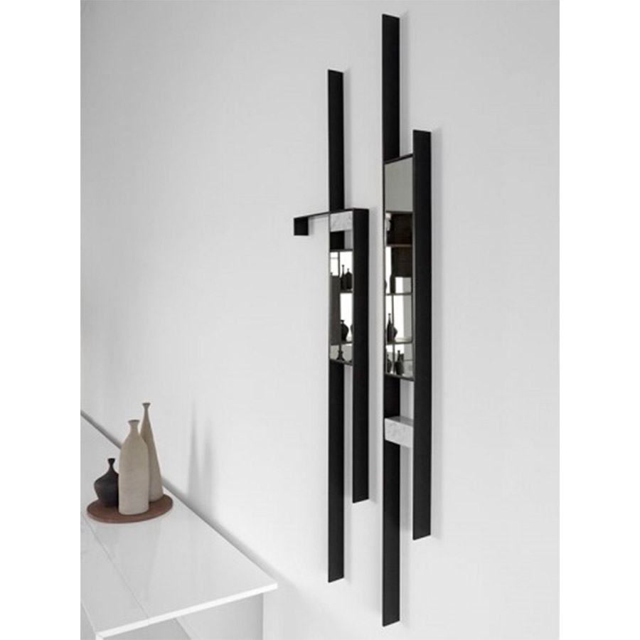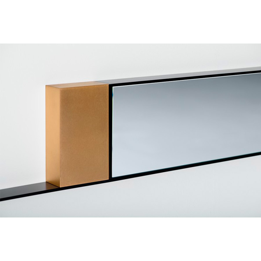 La mirada es emocionante: en el marco pintado con níquel negro mate o níquel perla mate, junto a la luz reflejada por los espejos, se destacan las inserciones decorativas en diferentes materiales: mármol de Guatemala, mármol blanco de Carrara o en ónix verde o latón, este último con un efecto iridiscente.