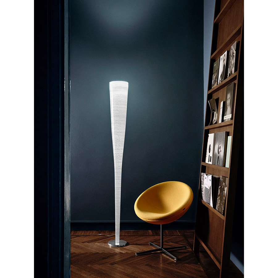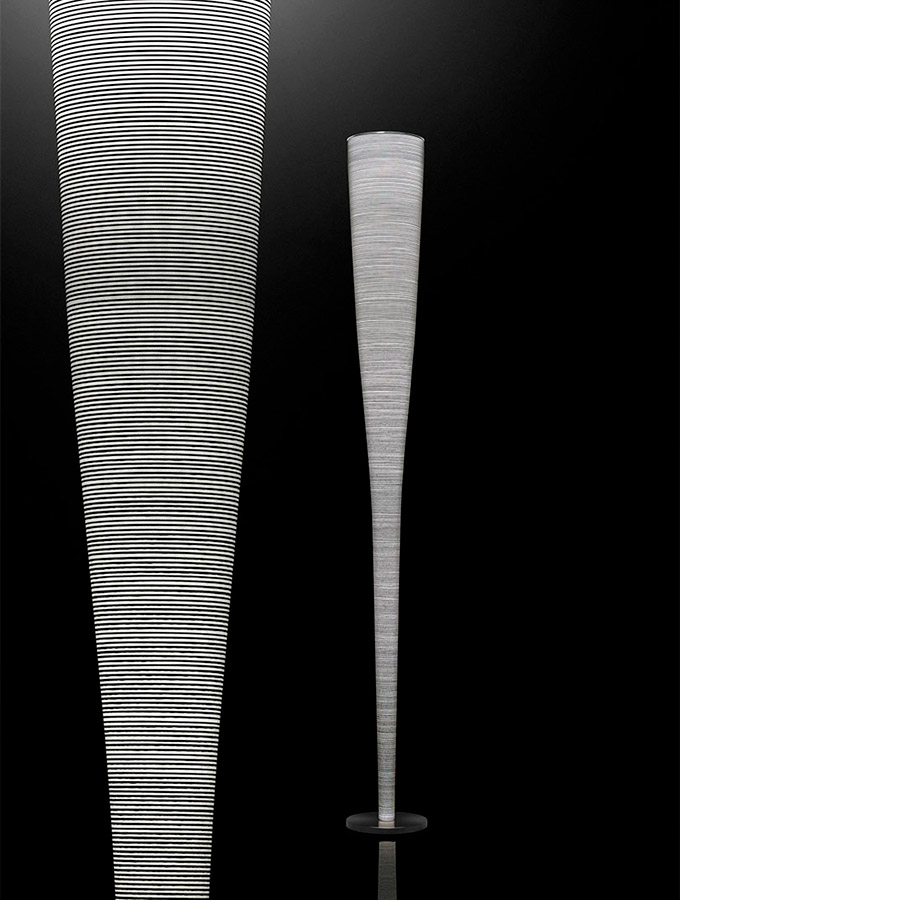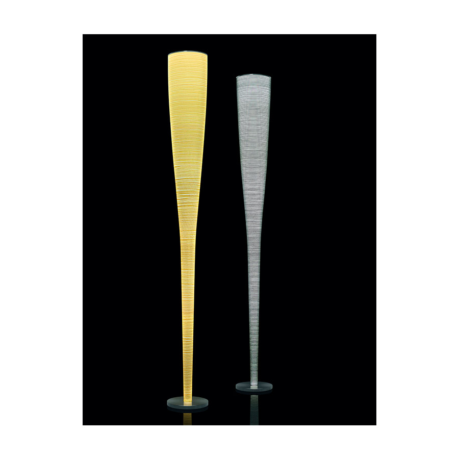 Marc SadlerLámpara de pie de luz difusa e indirecta. Difusor obtenido con un proceso artesanal en el que está prevista la aplicación de un cable en Kevlar® para la versión amarilla y en carbono para la versión negra sobre tejido de vidrio. Vástago interno en metal; la parábola superior en acero cepillado hace las veces tanto de bloqueo del difusor en el vástago como de reflectante de la luz dentro del difusor. Base en acero niquelado, el cable transparente dispone de un dimmer que hace las veces tanto de regulador de intensidad luminosa gradual como de interruptor on/off.