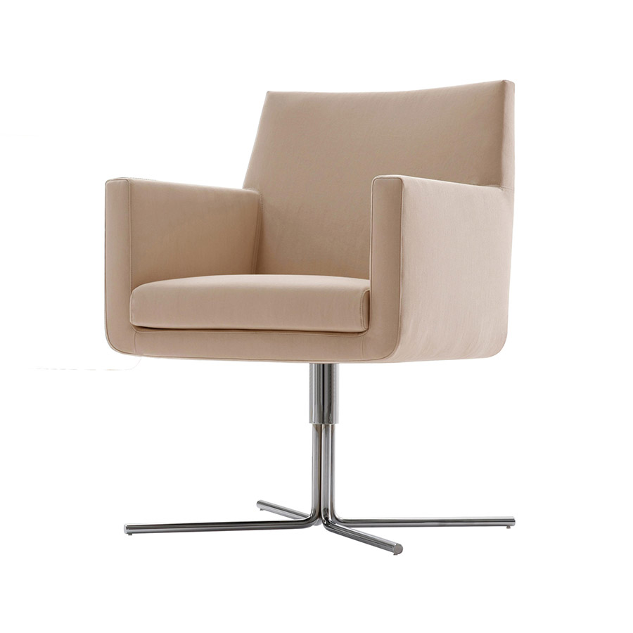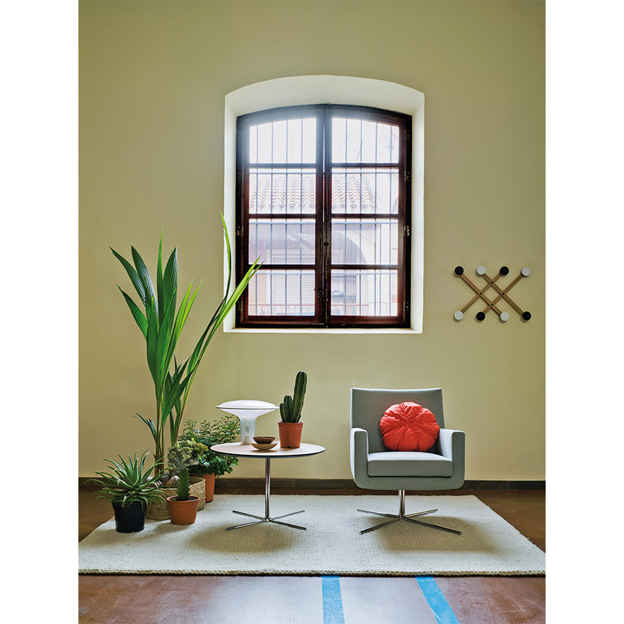Dulzura formal para un diseño orgánico realizado por La Cubitera. La curvatura de las esquinas frontales resalta la forma en U del asiento y redondea la pieza. El pie central en forma de aspa caracteriza al modelo. Moss está disponible en versión fija y giratoria.