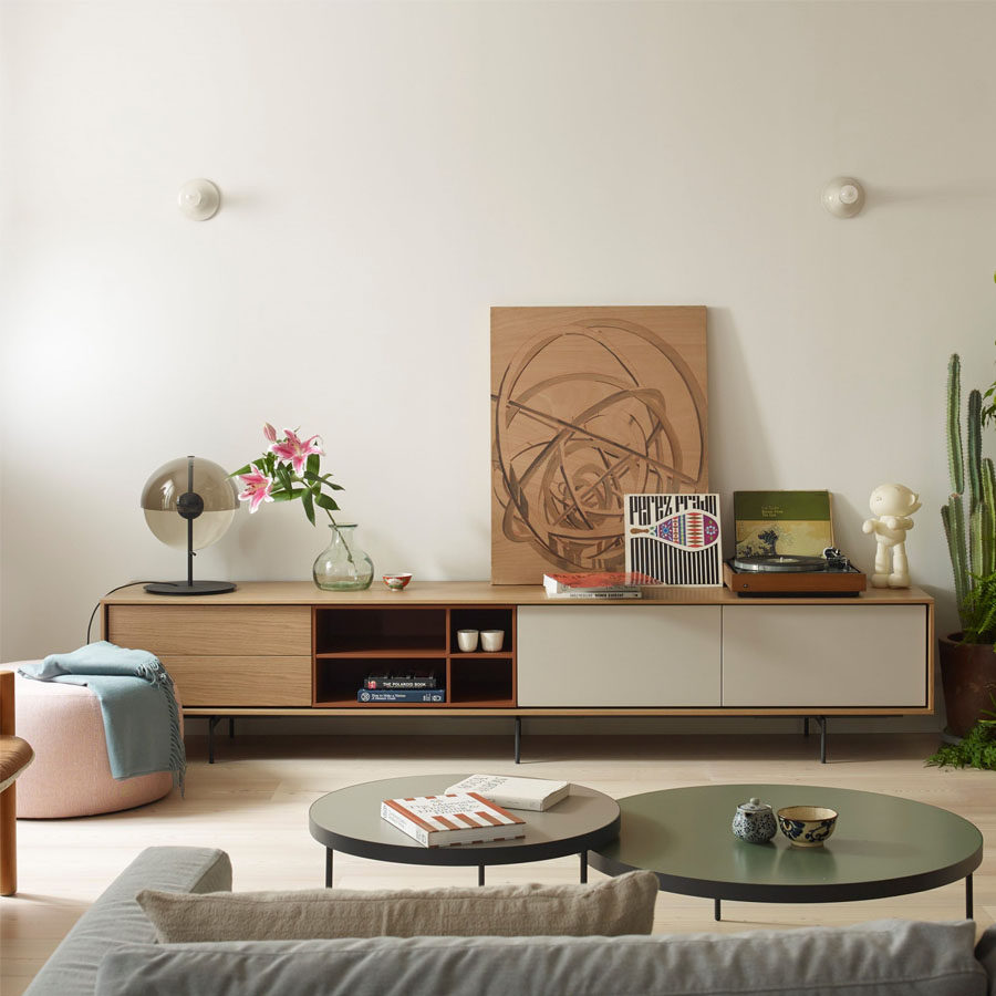 Mueble TV de la colección Iconic de Treku, diseñada por Angel Martí & Enrique Delamo. En esta distribución concreta el mueble de TV Aura se fabrica en 3 semanas. Los modulos en laca pueden elegirse en cualquiera de los colores de la paleta de Treku.