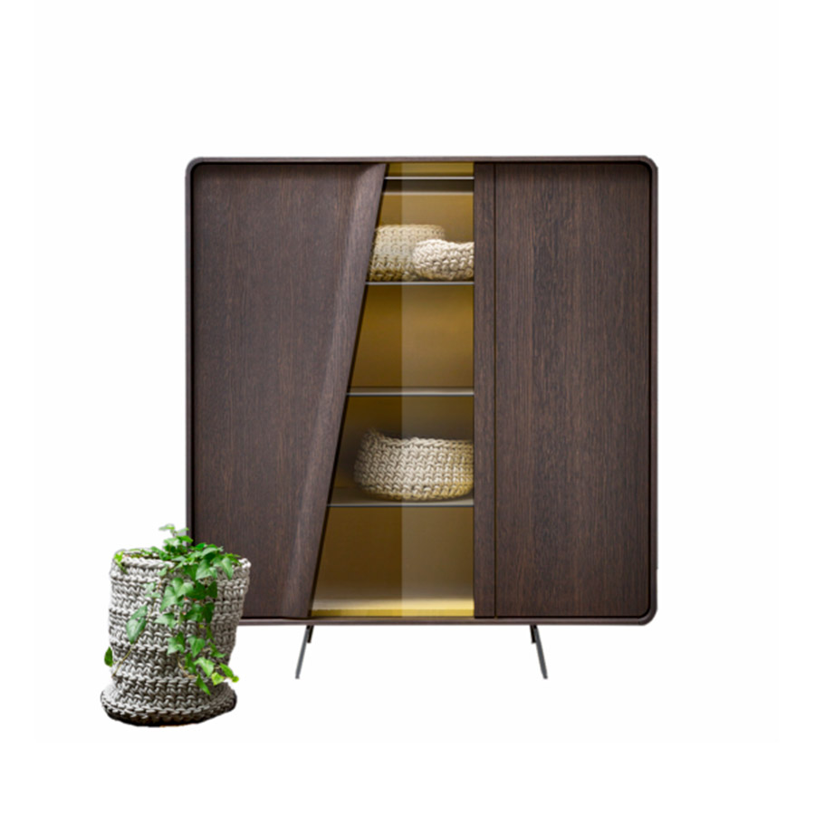 Musa está disponible en versión aparador, aparador alto o vitrina y se distingue por las formas redondeadas de la estructura y por el corte inclinado de las puertas, que ocultan el tirador y siguen las líneas de las patas de metal barnizado. El interior puede estar lacado e incluir, en el caso del aparador, una cómoda cajonera.