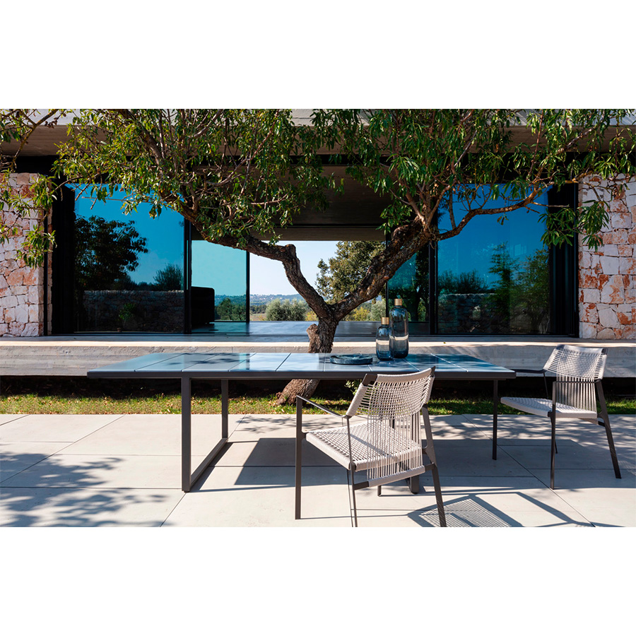 Yabu PushelbergLa ligera silueta de la silla Nodi se caracteriza por la cuerda retorcida de Canax®, resistente a la intemperie, que se extiende geométricamente sobre un fino y escultural bastidor de acero inoxidable con recubrimiento de polvo. Sus proporciones refinadas y el enfoque minimalista de los materiales confieren una ligereza informal a la colección.