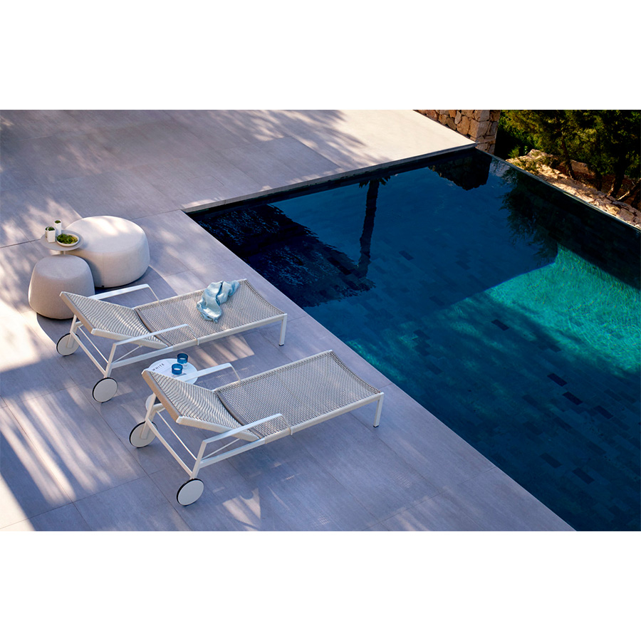 Yabu PushelbergLas estructuras blancas incluyen tejidos de color linen o blanco roto, mientras que las estructuras wengé utilizan tejidos de color linen. Ligera y refinada, la tumbona Nodi combina minimalismo con un toque informal y ligero.