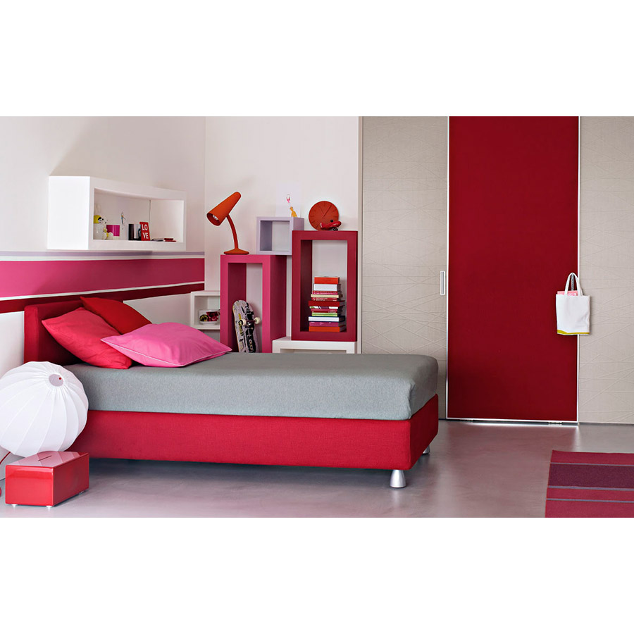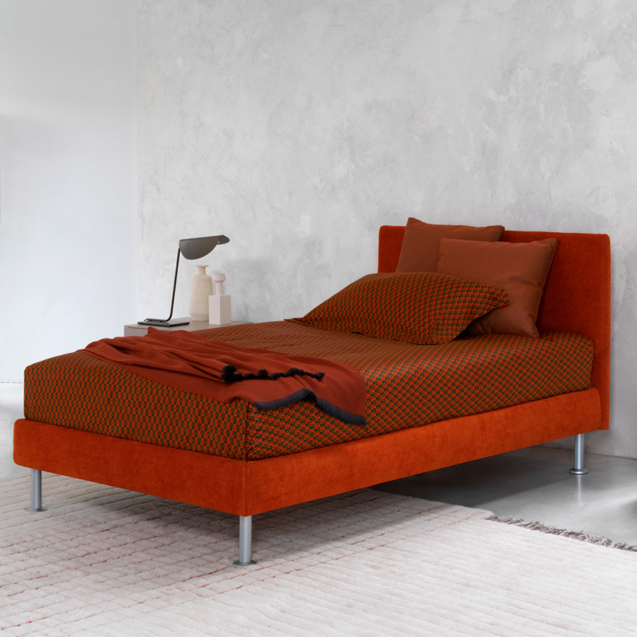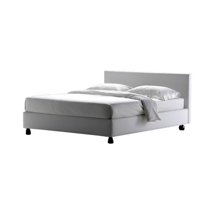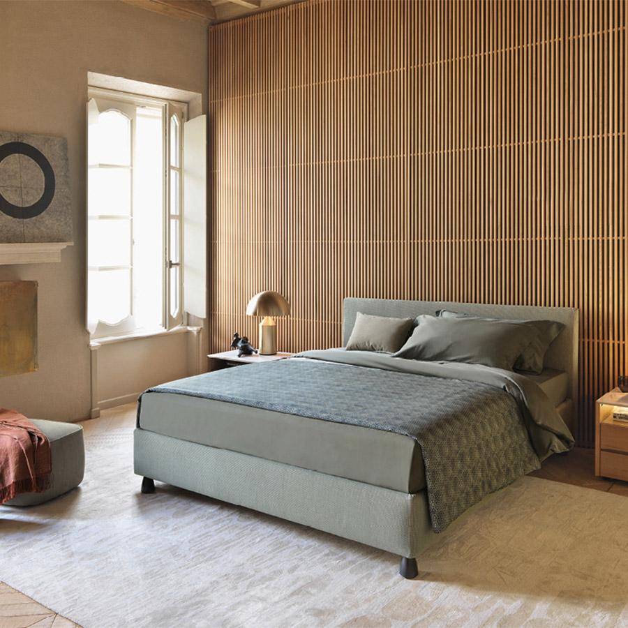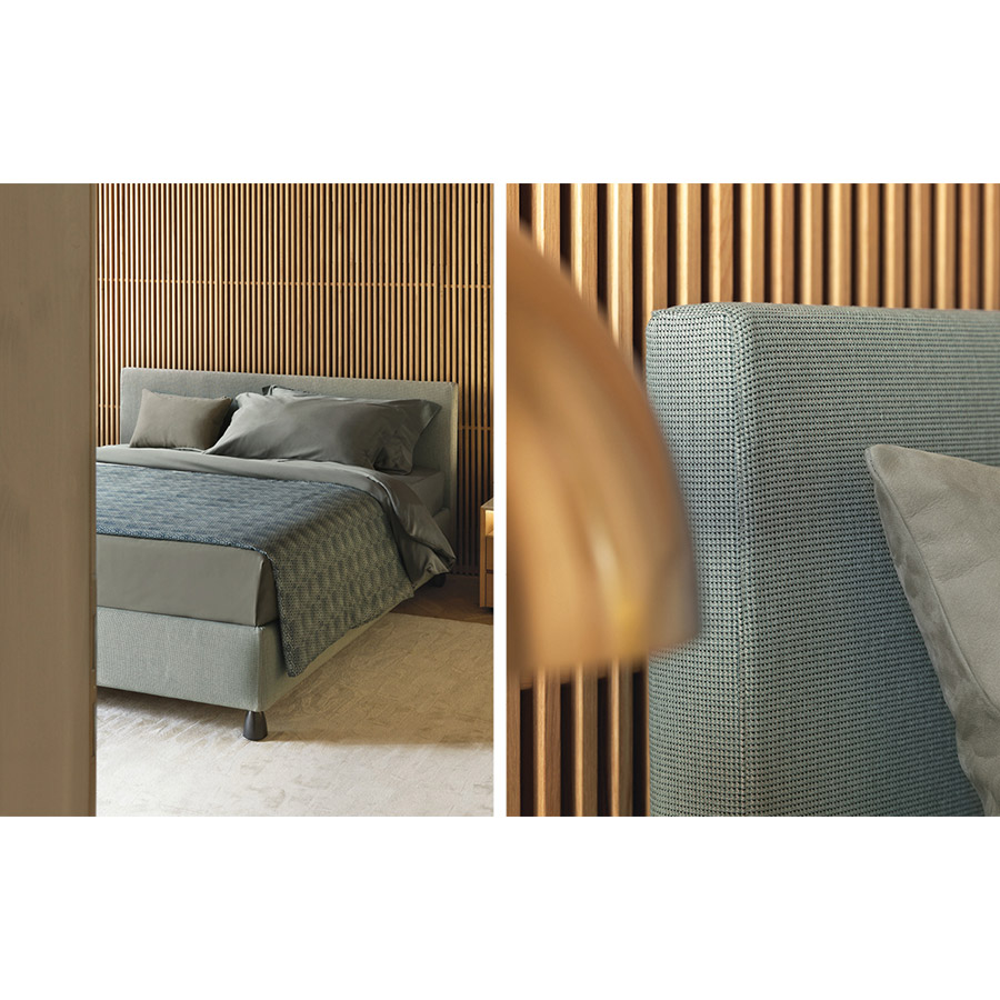 Centro Ricerche FlouCama de líneas simples y esenciales. Disponible con base de muelles Leonardo, base contenedor, base fija h 25 cm o h 16 cm y con somieres con movimiento eléctrico. Base y cabecera disponibles en dos alturas y forradas en tejido, piel o Ecopelle desenfundables gracias al velcro, igual que la base.