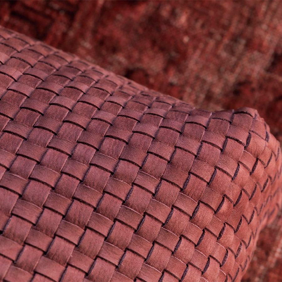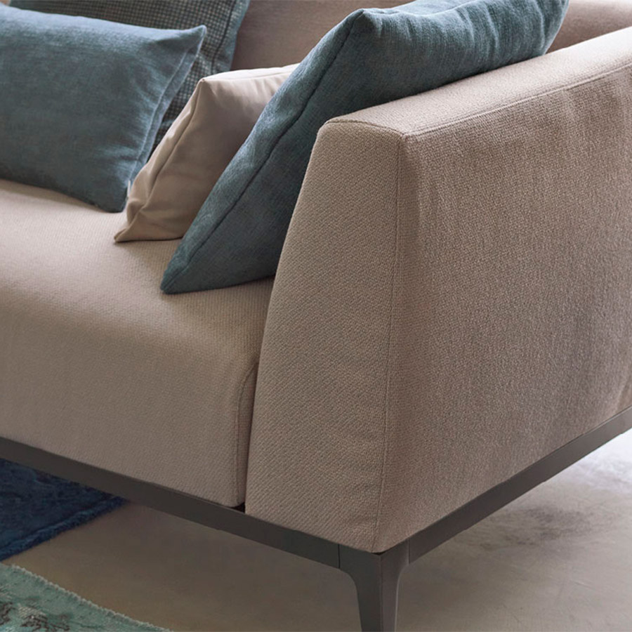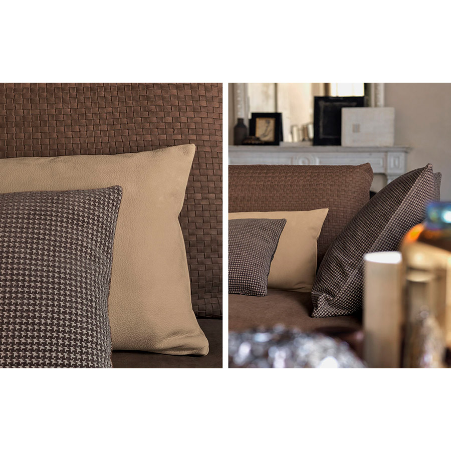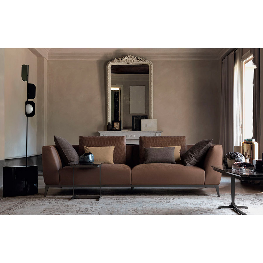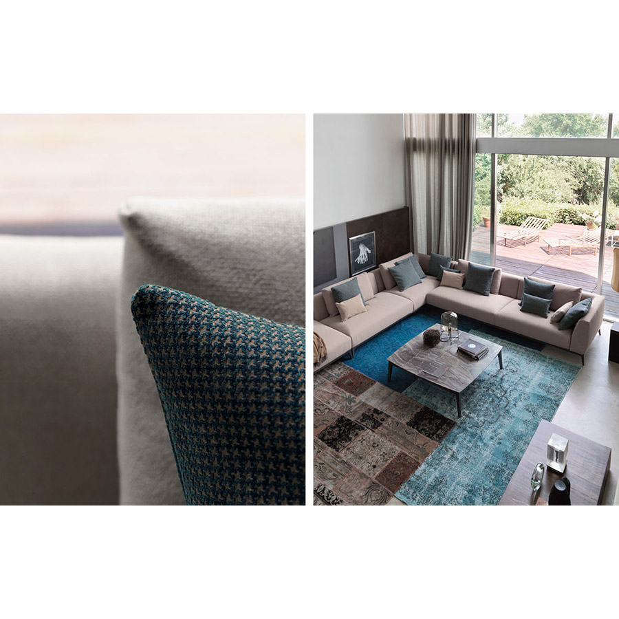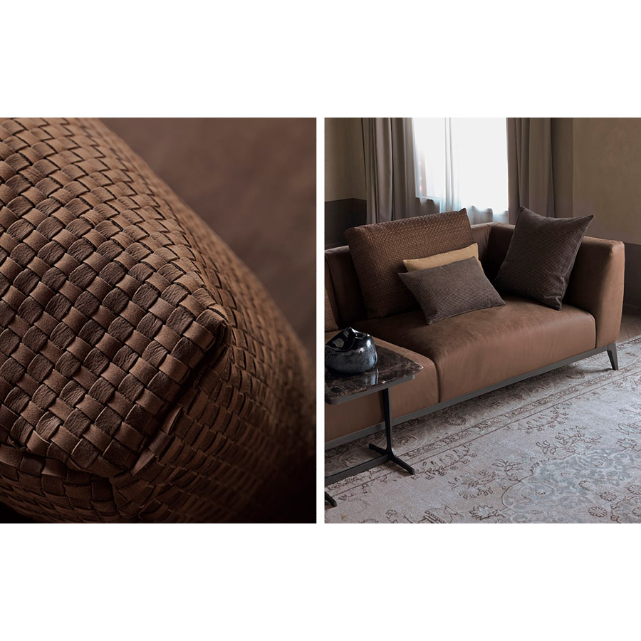 Estructura de tubular de acero, acabado bruñido mate con base con correas elásticas trenzadas, revestida en tejido jersey.Asiento y respaldo con revestimiento desenfundable en tejido, piel o Ecopelle Dollaro. Enriquecen las composiciones grandes cojines de soporte para el respaldo realizables con los tejidos de la colección Flou además que con el característico revestimiento en piel entrelazada y cojines decorativos de varias medidas.
