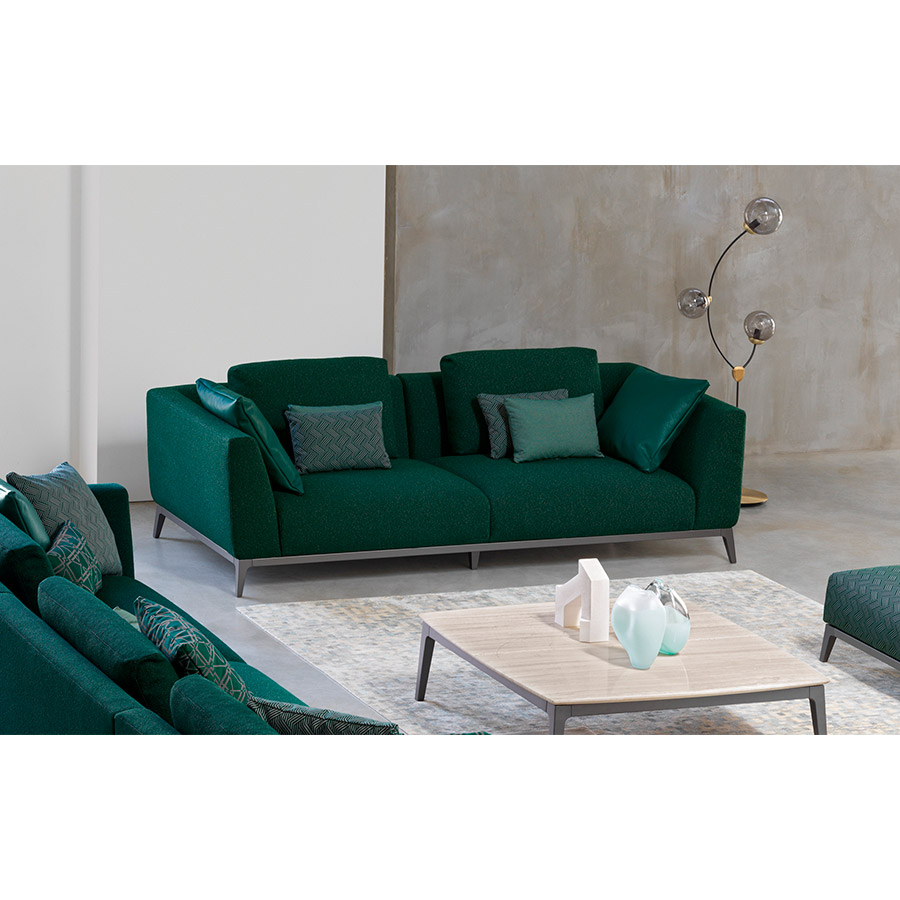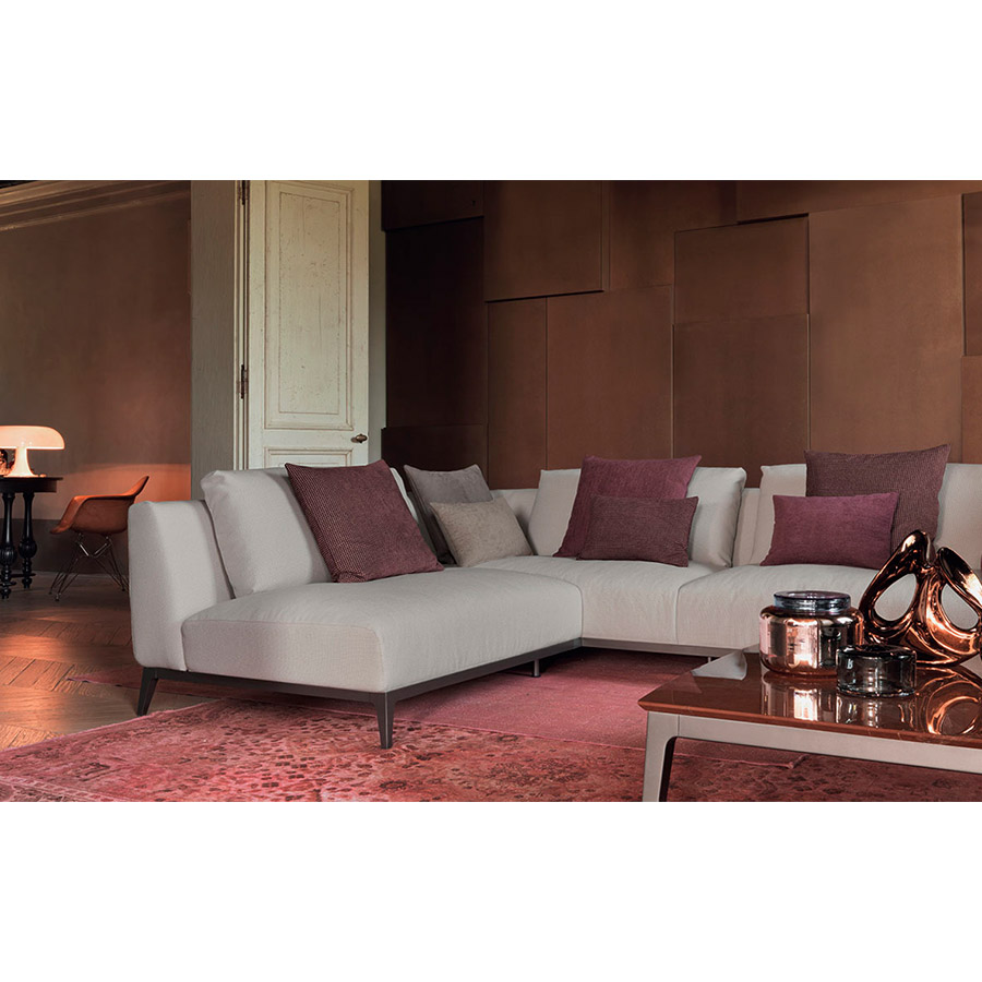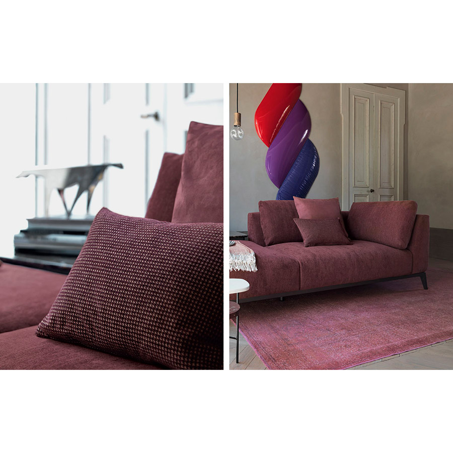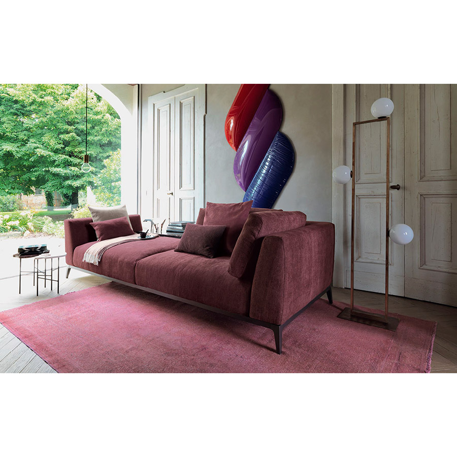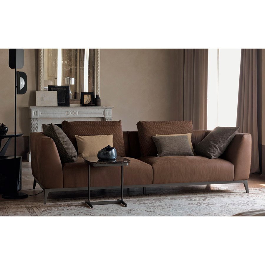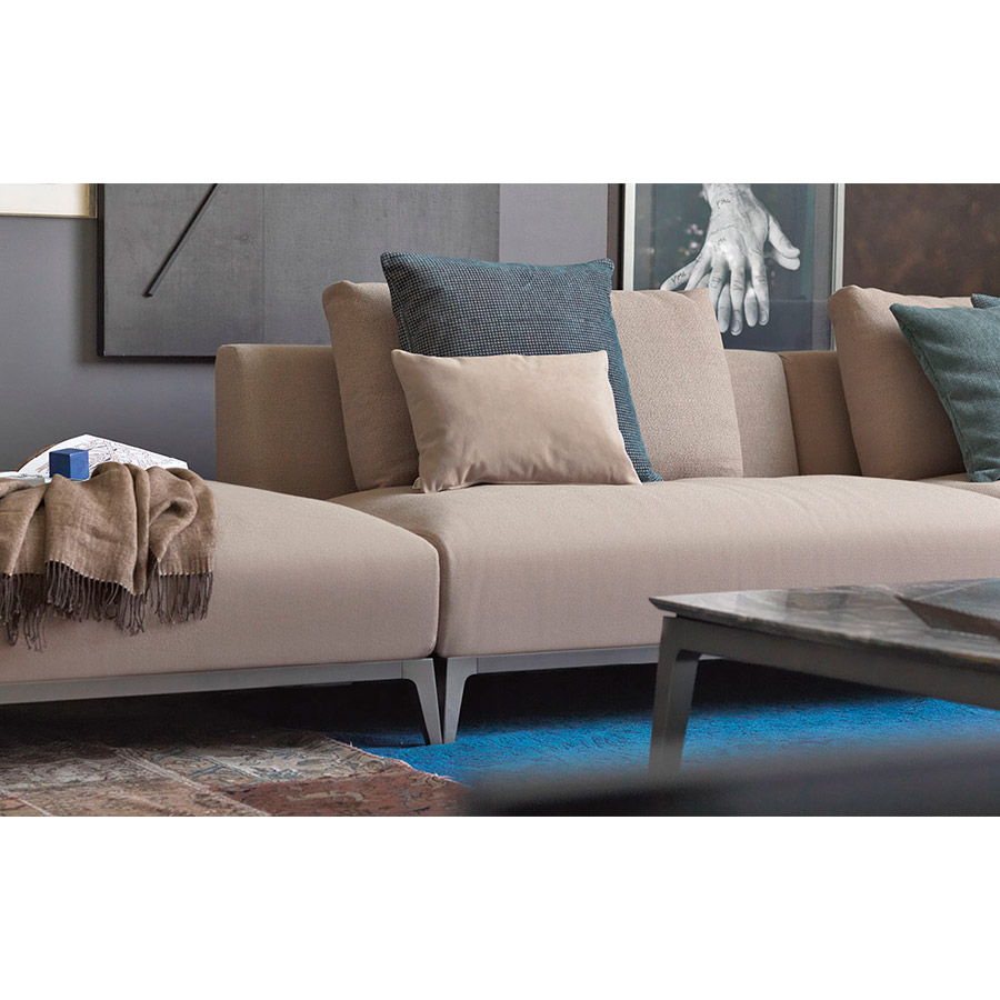Estructura de tubular de acero, acabado bruñido mate con base con correas elásticas trenzadas, revestida en tejido jersey.Asiento y respaldo con revestimiento desenfundable en tejido, piel o Ecopelle Dollaro. Enriquecen las composiciones grandes cojines de soporte para el respaldo realizables con los tejidos de la colección Flou además que con el característico revestimiento en piel entrelazada y cojines decorativos de varias medidas.