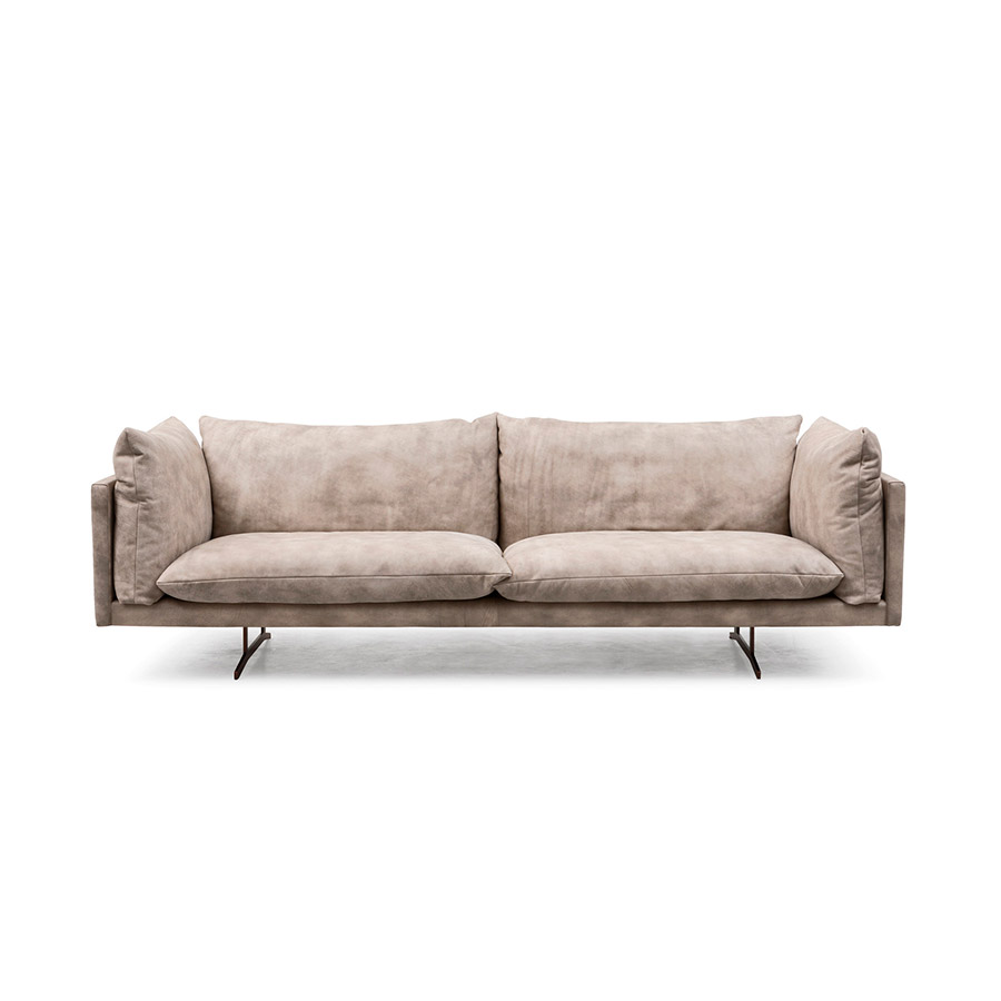 Enrico CesanaEn el sofá Oslo, los mullidos rellenos se funden con la forma regular de la base y los reposabrazos. Oslo descansa con elegancia sobre patas de metal barnizado y está disponible en cinco anchos y dos variantes de sillón.