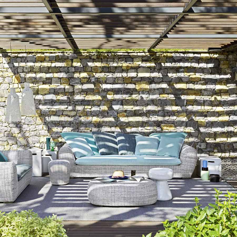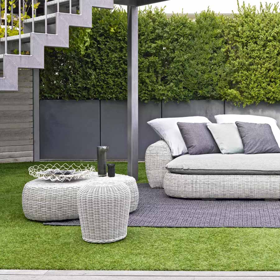 La forma triangular con esquinas redondeadas y los volúmenes plenos caracterizan a la mesa de centro Panda 11, formada por estructura y patas de aluminio y entramado de fibra sintética de polietileno Panda Resin blanca/gris. Fibras sintéticas de última generación, diseñadas para resistir al agua y a la luz y para conservar las cualidades técnicas y cromáticas a lo largo del tiempo, mantienen un aspecto muy natural y duradero.