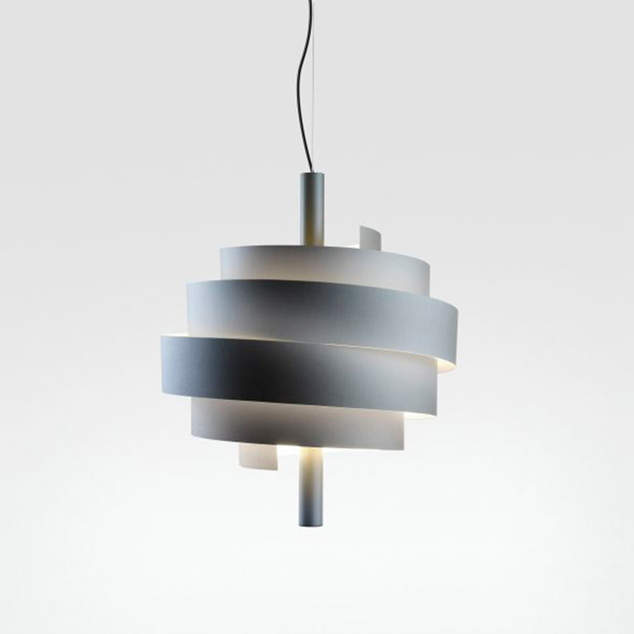 La forma en espiral de la pantalla rompe la monotonía del objeto, que cambia según el punto de vista en que se mire. El tubo central nos transfiere simetría y solidez que contrasta con la pantalla volátil y variable. Disponible en 4 colores, tanto la estructura como la pantalla se ofrecen siempre del mismo color, y así la lámpara se percibe como un solo objeto. De este modo, por contraste, la luz adquiere mayor protagonismo.