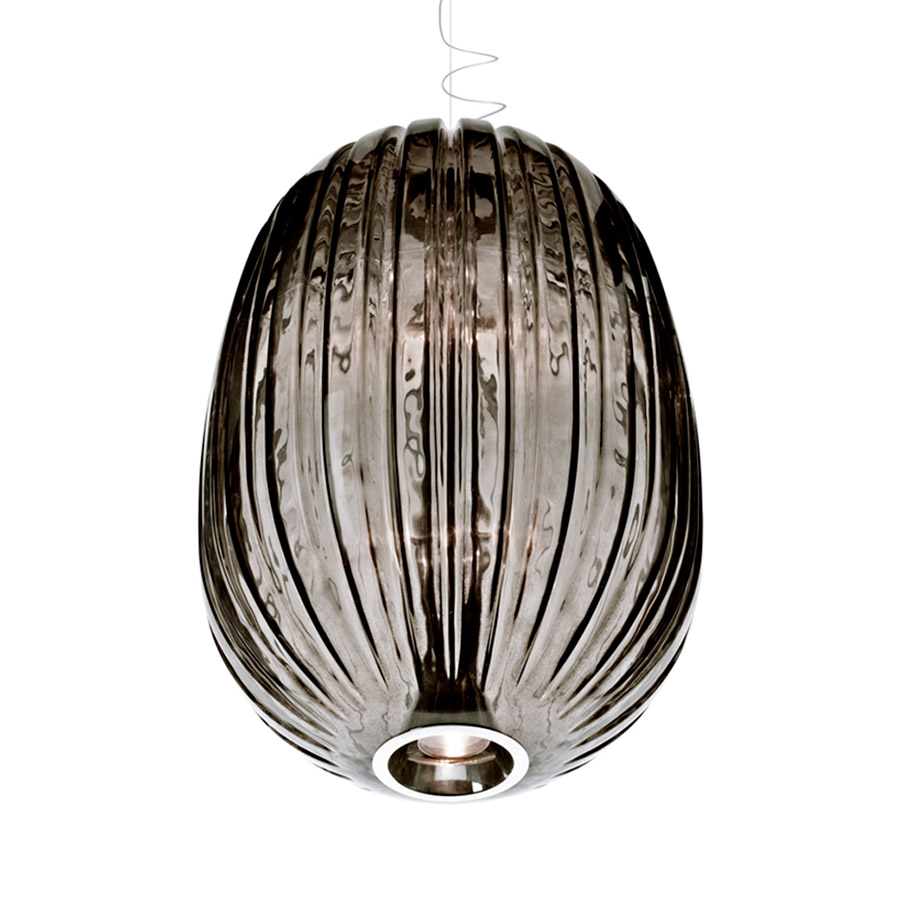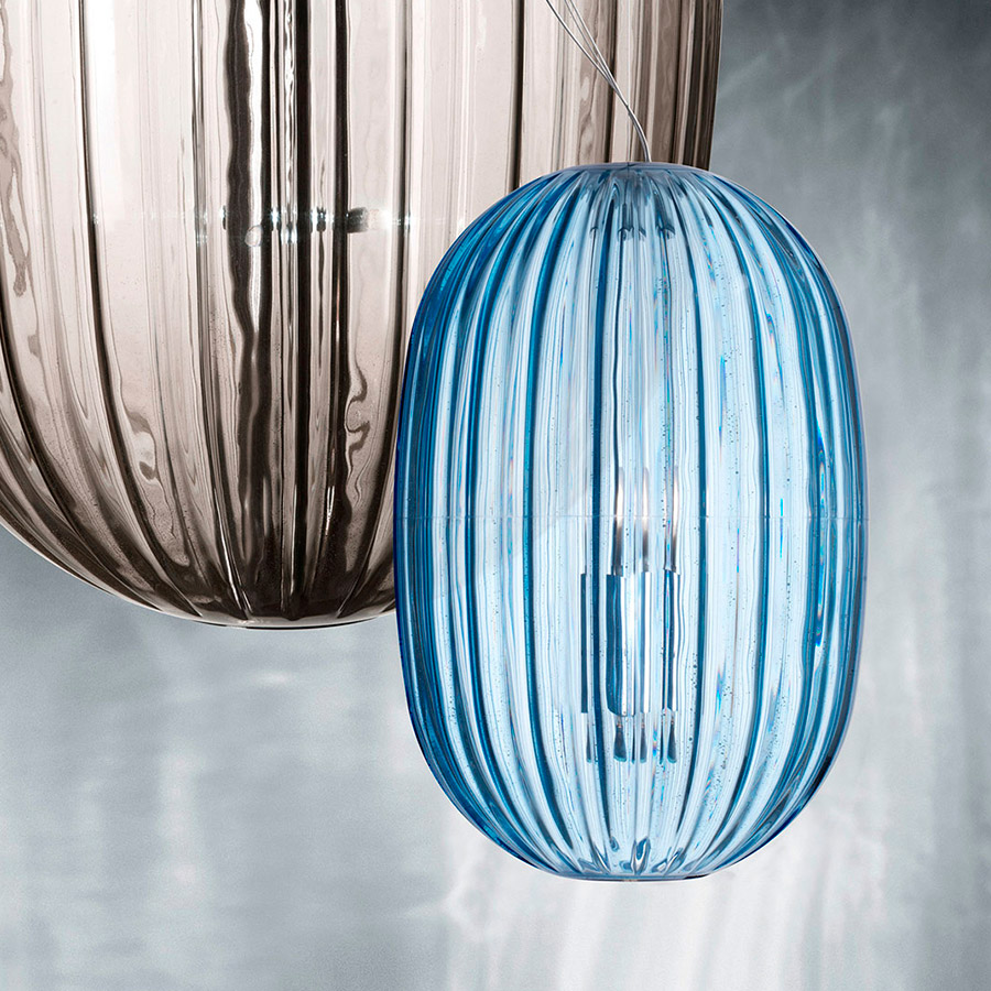 Luca NichettoPlass, cuyo nombre nace de la síntesis de «plastic» y «glass», interpreta la milenaria tradición artesanal del vidrio, a la luz de un material y de un proceso contemporáneo: el policarbonato transparente moldeado en rotacional. Gracias a esta tecnología, todavía no utilizada en una escala muy amplia en el sector de la iluminación, los acabados no resultan impersonales y fríos sino que, al contrario, están caracterizados por ligeras irregularidades, evidenciadas por la fuente luminosa, como en el vidrio artesanal. Los colores escogidos para el difusor, verde azulado y gris, se inspiran en el vidrio de murano y en la artesanía veneciana. Además de evocar una atmósfera y una emoción, el color contribuye en la definición de la forma de la lámpara, evidenciando el espesor de las incisiones sobre sus superficies. Suspendida entre memoria y actualidad, Plass se presta a caracterizar espacios amplios, incluso desarrollados en altura, sola o en composiciones múltiples.