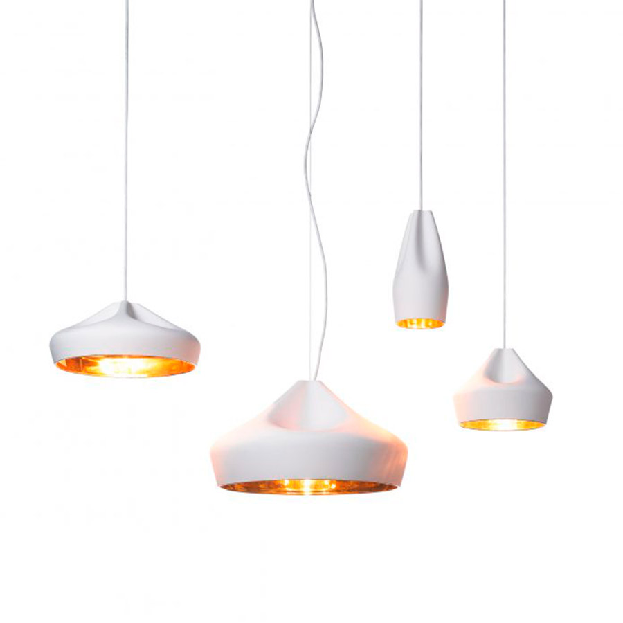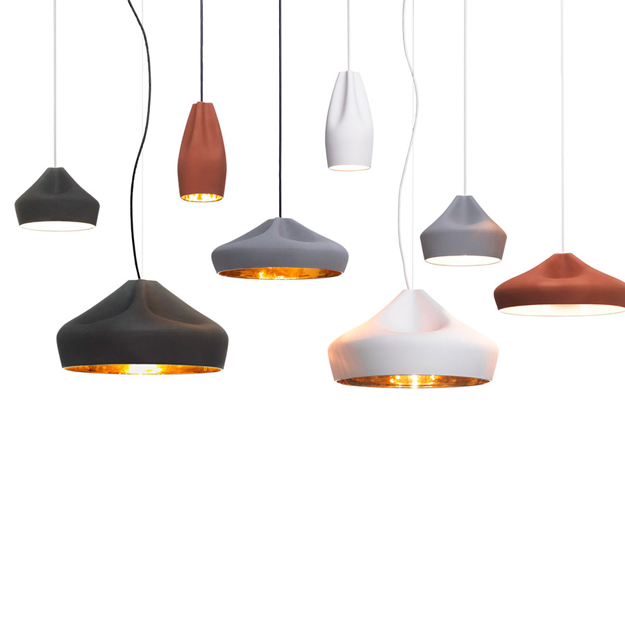 Xavier Mañosa & MashallahEl concepto de Pleat Box parte de un juego formal en el que tras diseñar digitalmente la caída del pliegue textil se aplica la silueta al material cerámico. El exterior de la lámpara se ofrece en cerámica blanca, negro, terracota y gris –resultado de reciclar diferentes esmaltes. El interior es de esmalte blanco brillante, que emite unos destellos que enriquecen la luz de la lámpara, o en oro de 24k generando una luz extremadamente cálida.