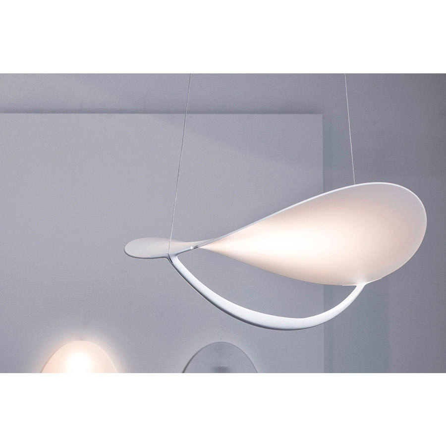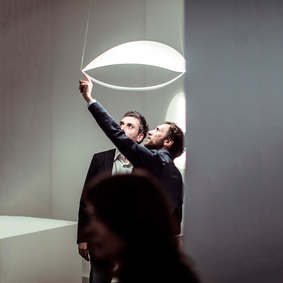 Eugenio Gargioni Guillaume AlbouyPlena cuenta con una doble iluminación: reflejada hacia el suelo y difusa hacia el techo. Es una luz de encanto e interés especial, capaz de iluminar completamente una habitación manteniéndose suave y envolvente. Si se coloca encima de una mesa, Plena no deslumbra nunca. Dos elementos que se compensan recíprocamente, con un rasgo de diseño que tiene intenciones casi poéticas: el disco de luna se vuelve de pluma, gracias a la línea arqueada que transmite una sensación de levedad y de vuelo.