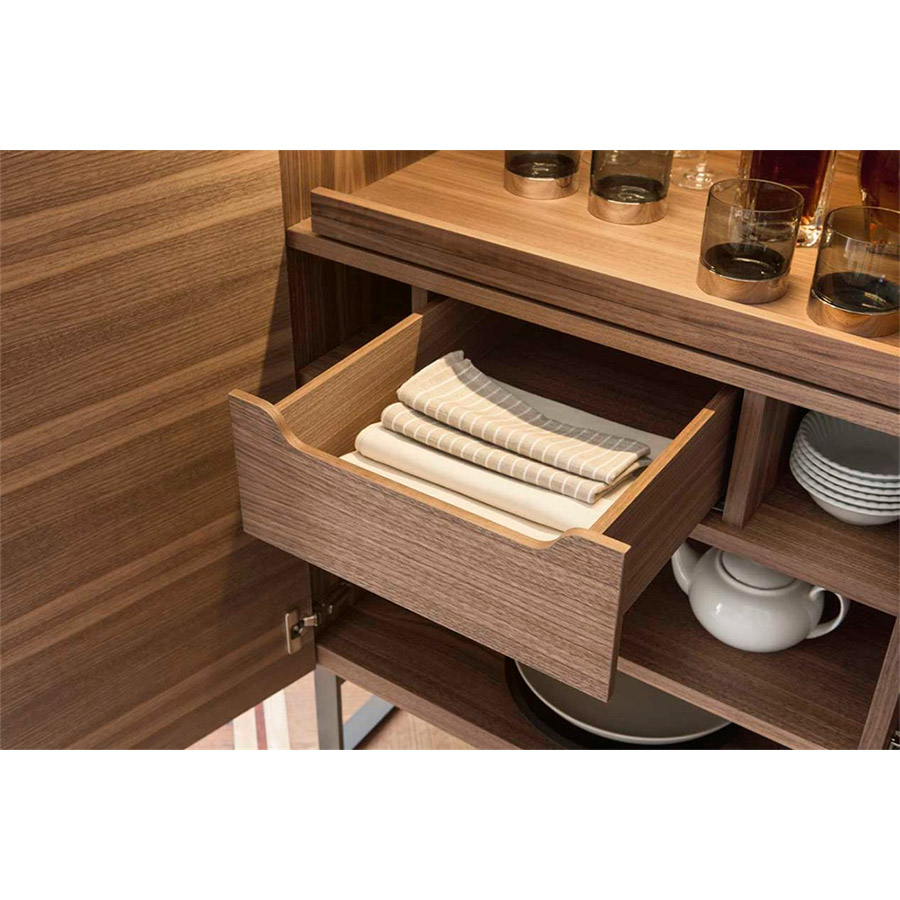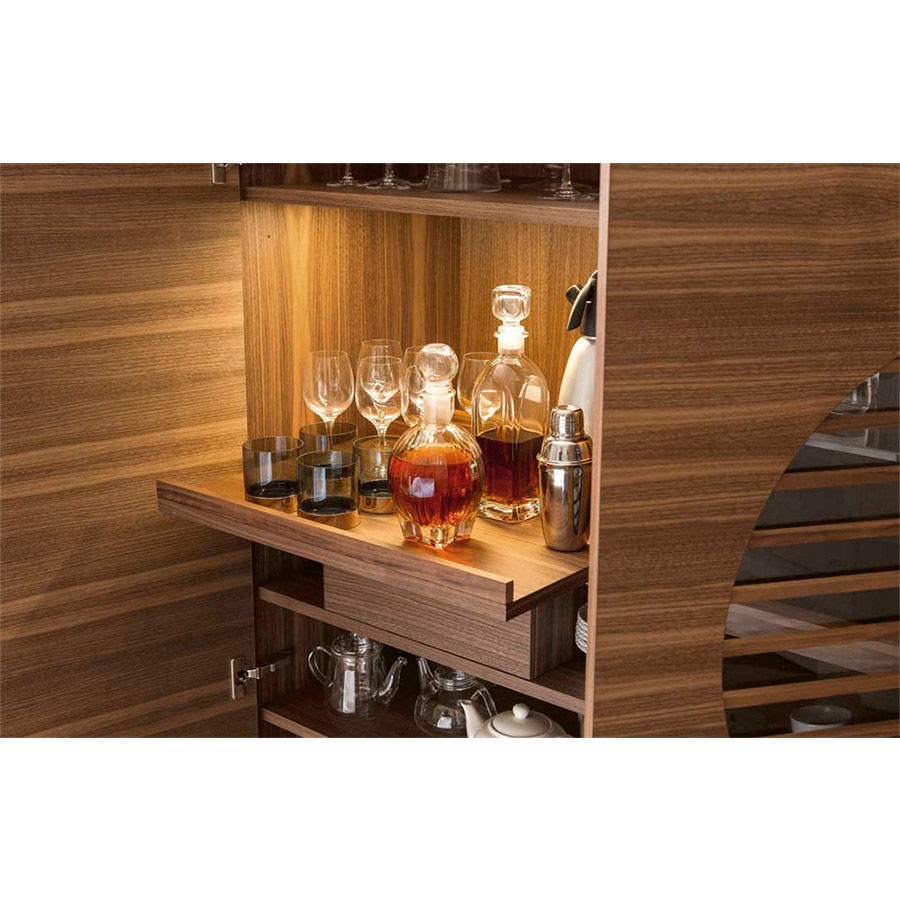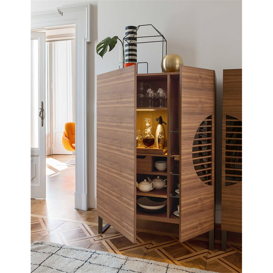 G. AzzarelloMueble bar de dos puertas en nogal canaletta con patas de metal. En el interior hay un compartimiento iluminado con luz de LED con tapa extraíble de madera, cajón, bandeja de madera revestida de cuero, estantes de cristales y de madera. Polifemo está disponible en versión derecha/izquierda, las medidas son 110x52x155H