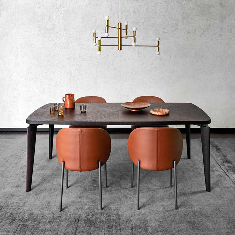 La colección de asientos tapizados RAKU —que abarca butaca + puff, sofá, silla y banqueta— ofrece una imagen moderna y sobria. El asiento y el respaldo están definidos por volúmenes simples y redondeados. Las patas, igualmente sencillas, están formadas por un tubo vertical que parece apoyarse simplemente por fuera de los volúmenes. La banqueta tapizada incluye también un reposabrazos de madera que la divide en sentido transversal, creando una superficie de apoyo funcional.