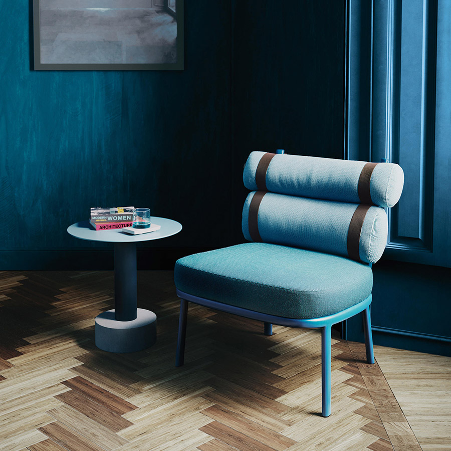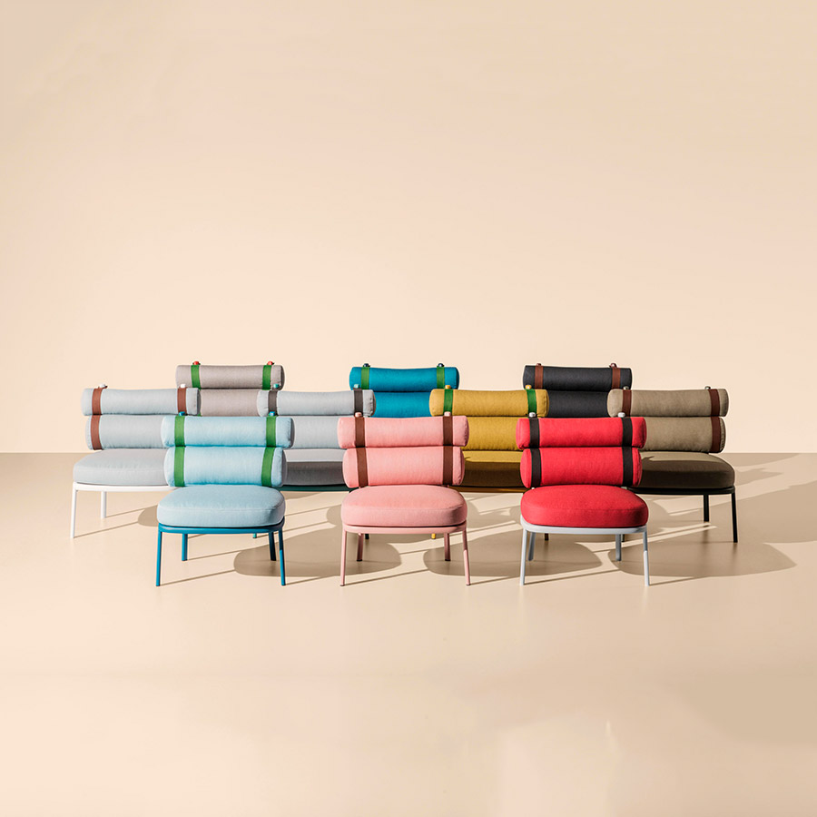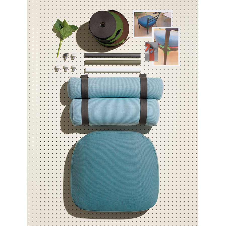 Patricia UrquiolaEste sillón transforma el respaldo convencional en dos cilindros unidos por tiras de color. La sencilla estructura de aluminio enmarca a los protagonistas de esta creación: sus cojines. Las tiras se unen a la estructura principal por medio de dos espigas que pueden quitarse con facilidad, permitiendo al usuario retirar los cojines y guardarlos durante el invierno. Un microtejido semitransparente sostiene el cojín del asiento.