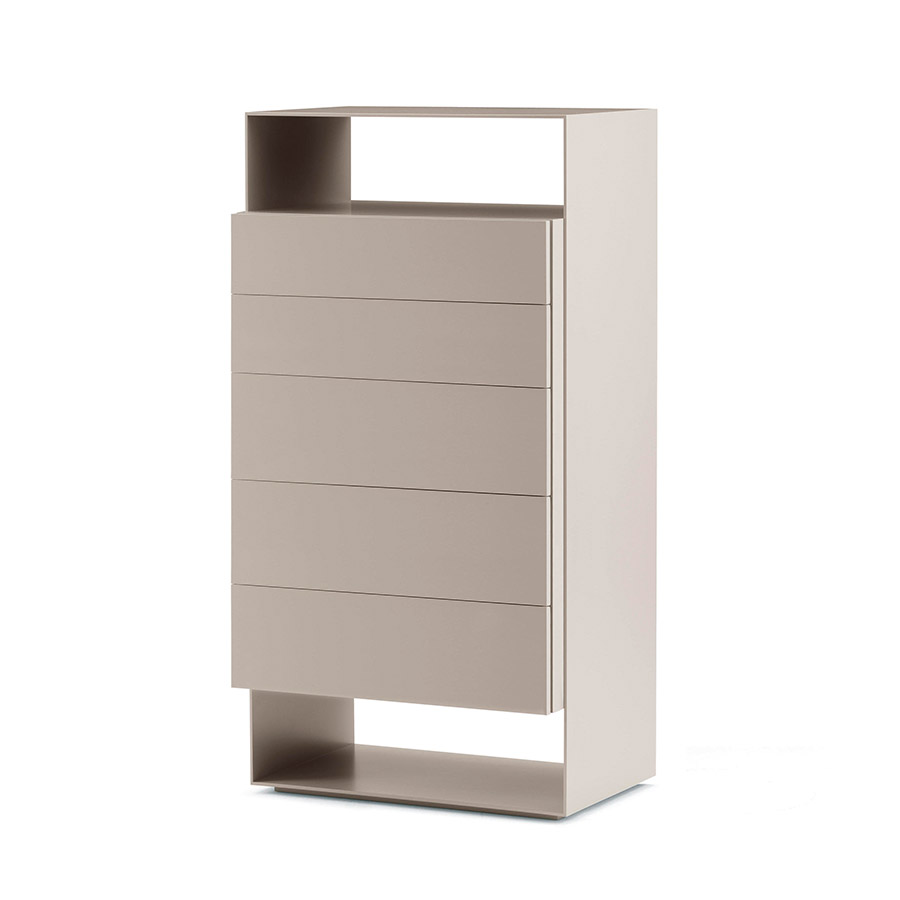 Carlo ColomboSerie de complementos para la zona noche formados de mesita de noche de un cajón y cómoda alta de cinco cajones. Estructura de aluminio y MDF. Cajones de extracción total con sistema de cierre amortiguado. Estructura y cajones lacados mate en los colores: blanco, crema, arena, bronce, gris oscuro, negro.