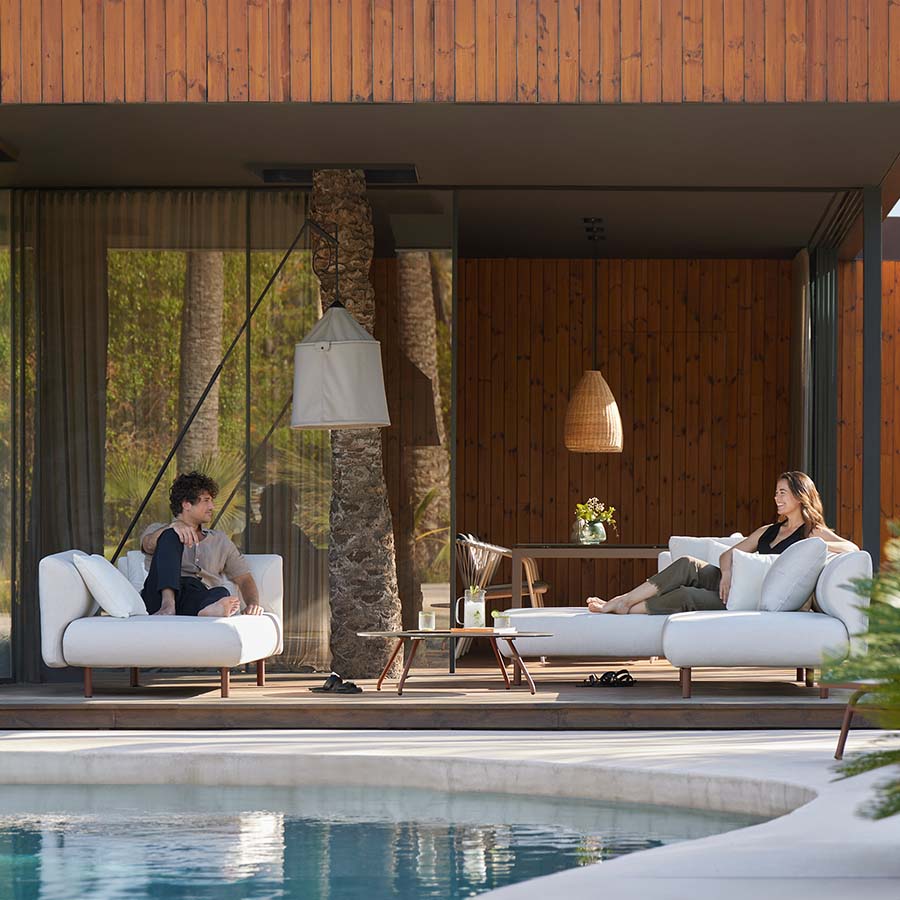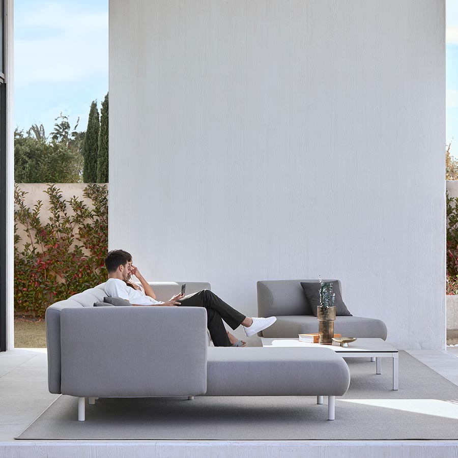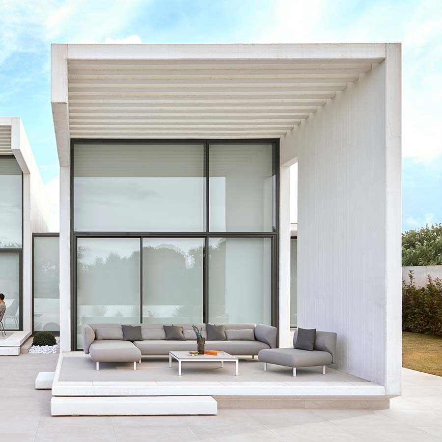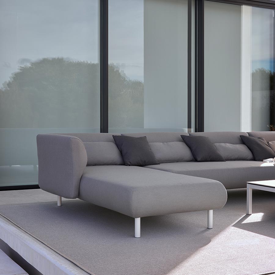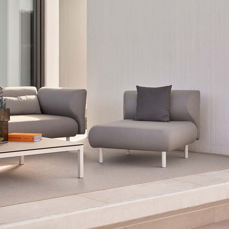 Colección de sofás modular de estructura completamente en acero inoxidable. Su característica principal es su sistema flexible de módulos de tres medidas, que se pueden configurar con o sin respaldos y que permiten una amplia variedad de combinaciones. La tapicería es desenfundable y los interiores están protegidos por una capa impermeable de poliéster.