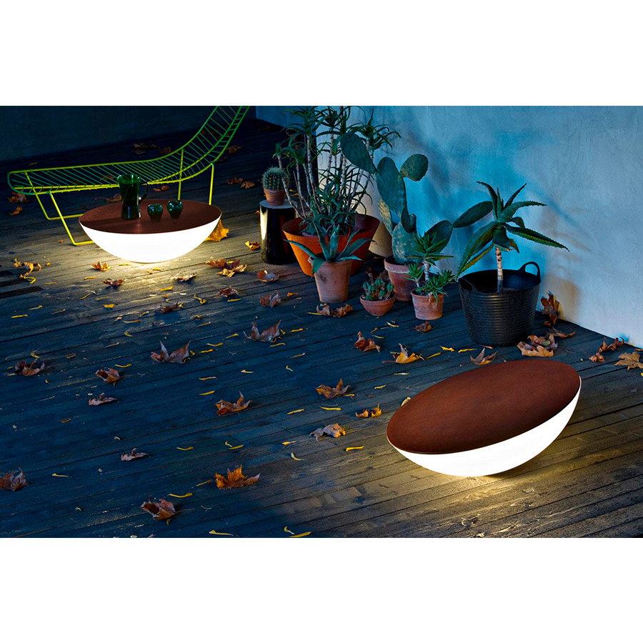 Solar es un hemisferio luminoso, realizado en polietileno, apoyado en el suelo y cubierto con una plataforma circular que escuda la luz y funciona contemporáneamente de apoyo. Solar se encuentra en sintonía con un concepto transversal del vivir, en el que el jardín se puede convertir en un ambiente de día.
