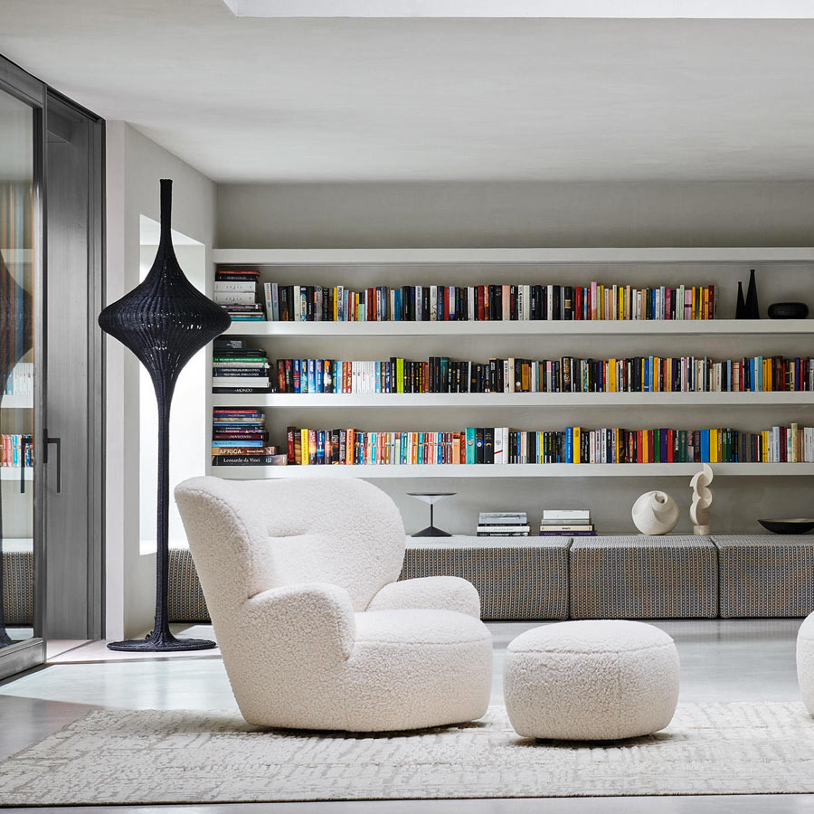 Paola NavoneLíneas sinuosas que recuerdan la envolvente forma de un nido caracterizan a la familia de lámparas de pie SPIN S/M/L, disponibles en 3 tamaños diferentes. La estructura envolvente que recuerda al huso de la rueca está realizada completamente en mimbre tejido natural, lacado en blanco mate, gris, océano, tórtola o negro. Es un producto capaz de crear un clima cálido y acogedor gracias a la luz que se filtra a través del entramado de fibra natural.