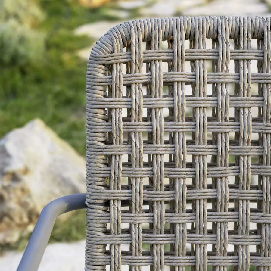 Simple y refinada, la familia de sillas Straw 23/24, con y sin brazos, se caracteriza por la estructura tubular de aluminio pintada de gris claro. Un producto sobrio y ligero, revestido con un entramado hecho a mano con cuerda de polietileno de doble torsión, una fibra con aspecto natural, fuerte, flexible y duradera, diseñada específicamente para el exterior.
