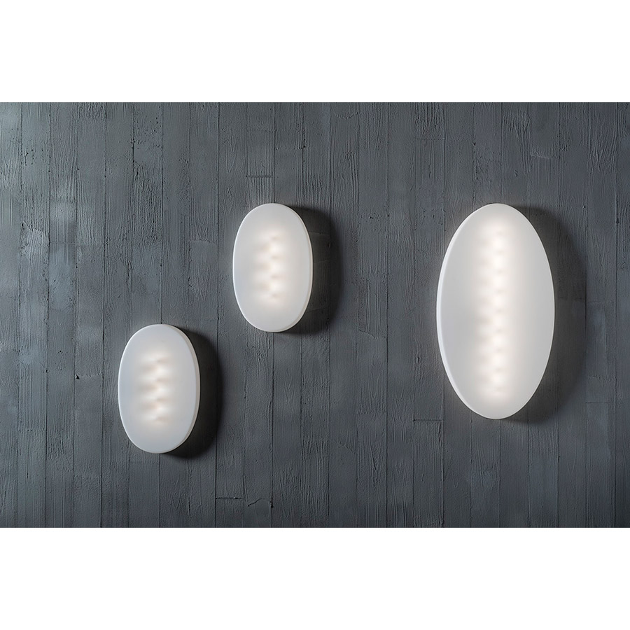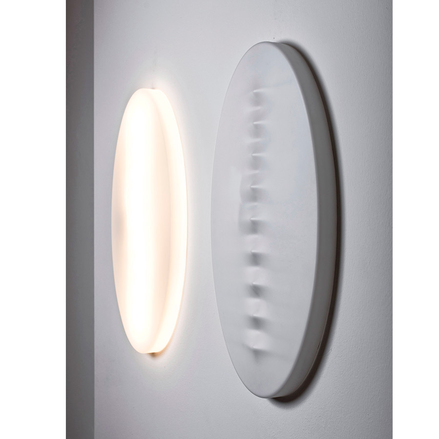 Calvi BrambillaAmueblar a través de la luz. Superficie es una lámpara de pared con una presencia y una geometría importantes, pero de grosor muy limitado. El rasgo – un óvalo limpio e insólito-, pero especialmente el movimiento de puntos cóncavos y convexos, y el juego de claroscuros que deriva de ello, convierten Superficie en una refinada protagonista del ambiente incluso cuando está apagada. Encendida, la lámpara propaga una luz intensa pero nunca deslumbrante. La bidimensionalidad de Superficie se hace posible también gracias a las posibilidades que ofrece la tecnología LED: la fuente luminosa se miniaturiza permitiendo grosores mínimos y una gran limpieza formal. Superficie, mucho más que un sencillo instrumento de iluminación, se propone como presencia icónica en los espacios domésticos o de intercambio: ilumina mientras amuebla, amuebla también cuando no ilumina. Sutil y versátil, Superficie se puede montar tanto vertical como horizontalmente. Caracteriza el ambiente, pero al mismo tiempo reduce los espesores al mínimo, encontrando una excelente colocación en itinerarios estrechos o donde se necesita un volumen discreto. Nacida para estar sola, Superficie vive bien incluso repetida en serie.