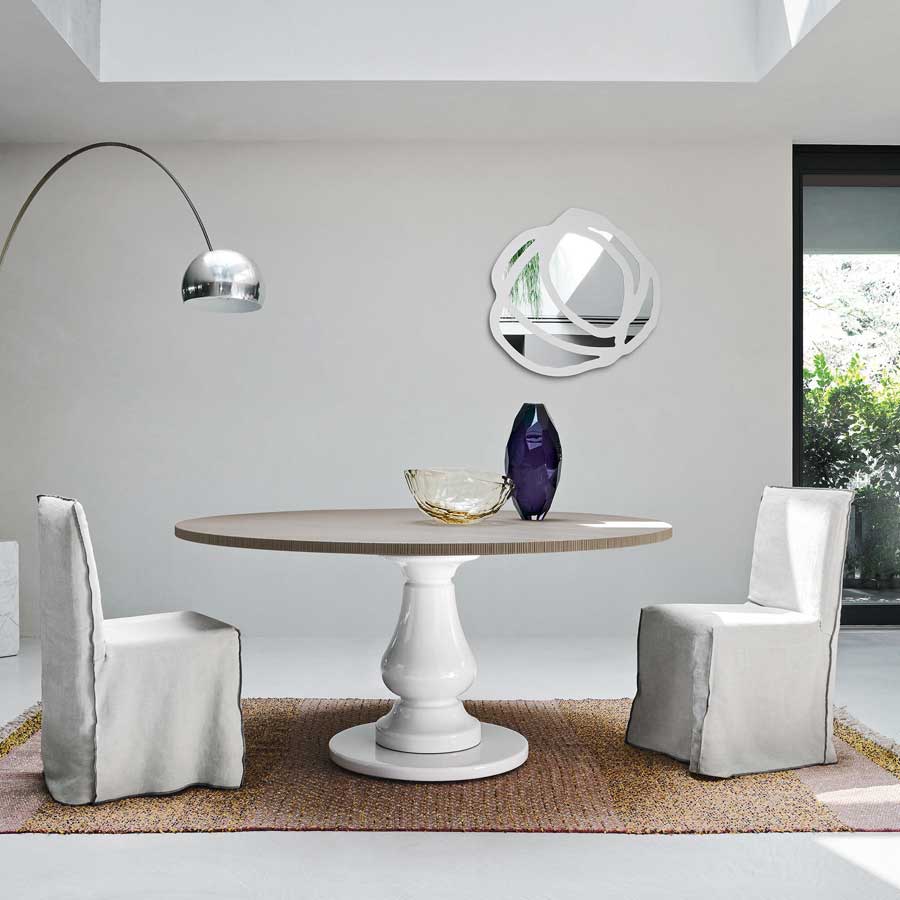 Familia de espejos de pared disponibles en dos tamaños, Sweet 97/98 se caracterizan por bordes redondeados e irregulares. Se trata de espejos con gran fuerza expresiva y decorativa, gracias al motivo serigrafiado en negro o blanco que dibuja sobre la superficie círculos o formas irregulares que se cruzan entre sí, en un juego de líneas superpuestas.