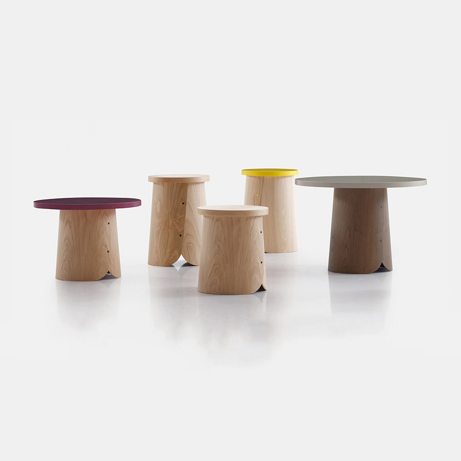 NadadoraIsaac Piñeiro, del estudio Nadadora nos propone unas simpáticas banquetas y mesitas cuya base está inspirada en los trobos, unas colmenas hechas con troncos de madera, muy típicas en el norte de la Península Ibérica.